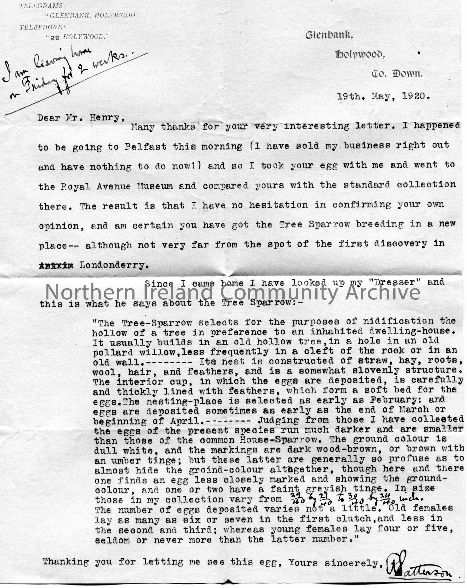 Typed letter to Sam Henry. Writing re the egg of a Tree Sparrow bird which Sam had sent him. He took it to the Royal Avenue Museum to compare with the collection there. States that he has sold his business. Includes an excerpt re the Tree Sparrow bird. Handwritten note at top of page informing Sam that he will be away for two weeks.