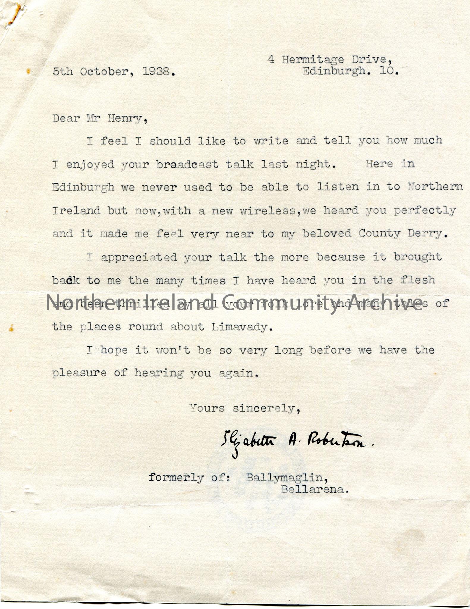 Typed letter to Sam Henry. Writing to let Sam know that they enjoyed his broadcast of 4th October. They used to live in County Derry and liked hearing the folk lore and stories of the places near Limavady. Received stamp from BBC Belfast 7th October 1938 on back of page.