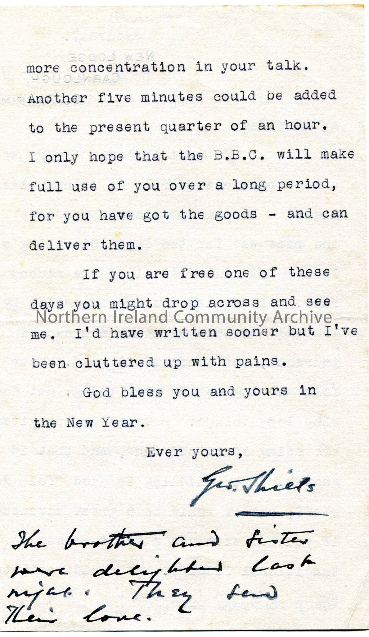 Typed letter to Sam. Number ‘3’ handwritten at top of page in pencil. Congratulates Sam on his broadcast on Friday night. Mentions Sieveking and Coult… – scan112b