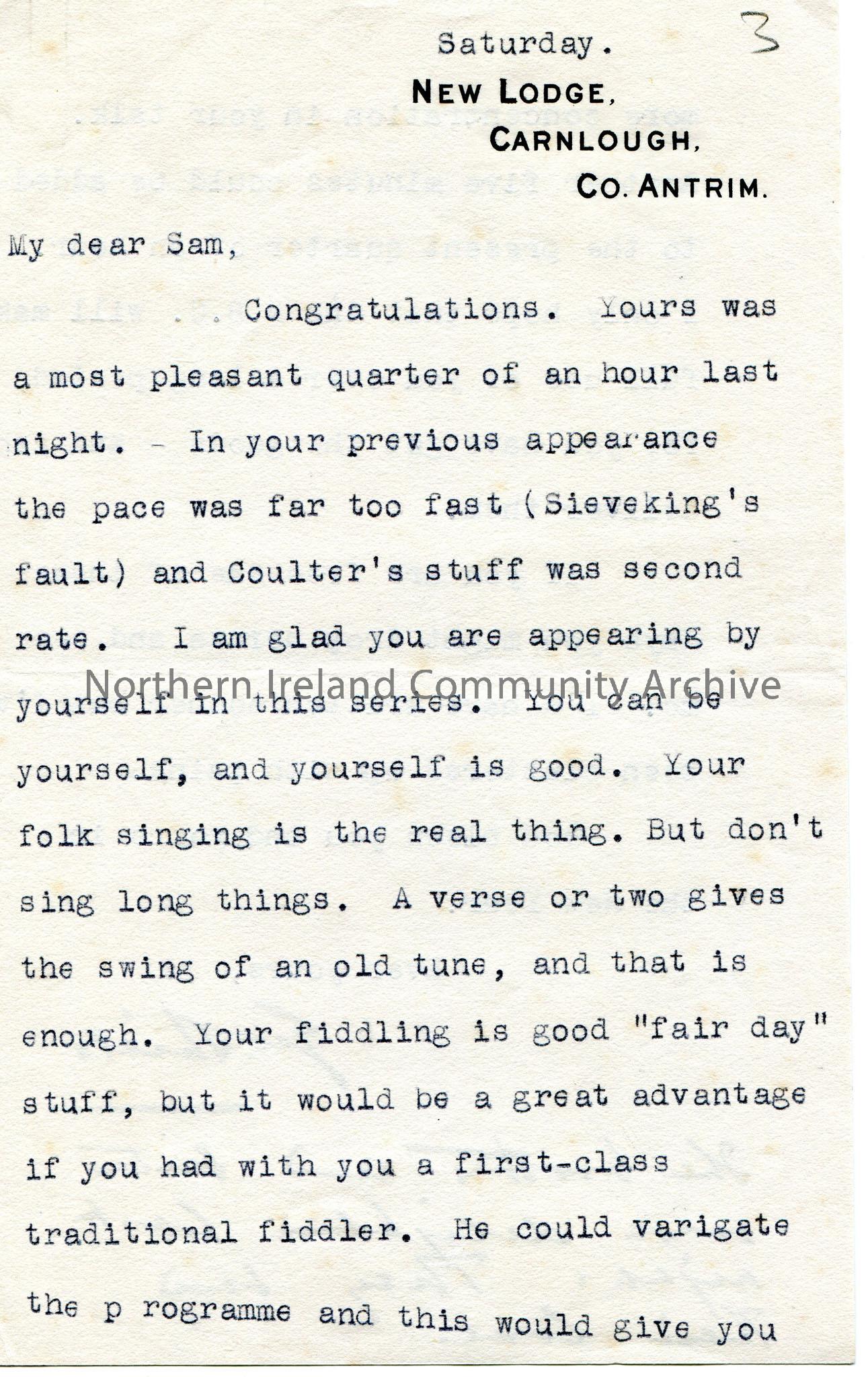 Typed letter to Sam. Number '3' handwritten at top of page in pencil. Congratulates Sam on his broadcast on Friday night. Mentions Sieveking and Coulter. Thinks Sam should appear by himself more but the songs would not be too long and recommends a traditional fiddler to play. Also believes the talk should be 5 minutes longer. Asks Sam to 'drop across' and see him. Handwritten note at end states that the brother and sister were delighted as send their love.