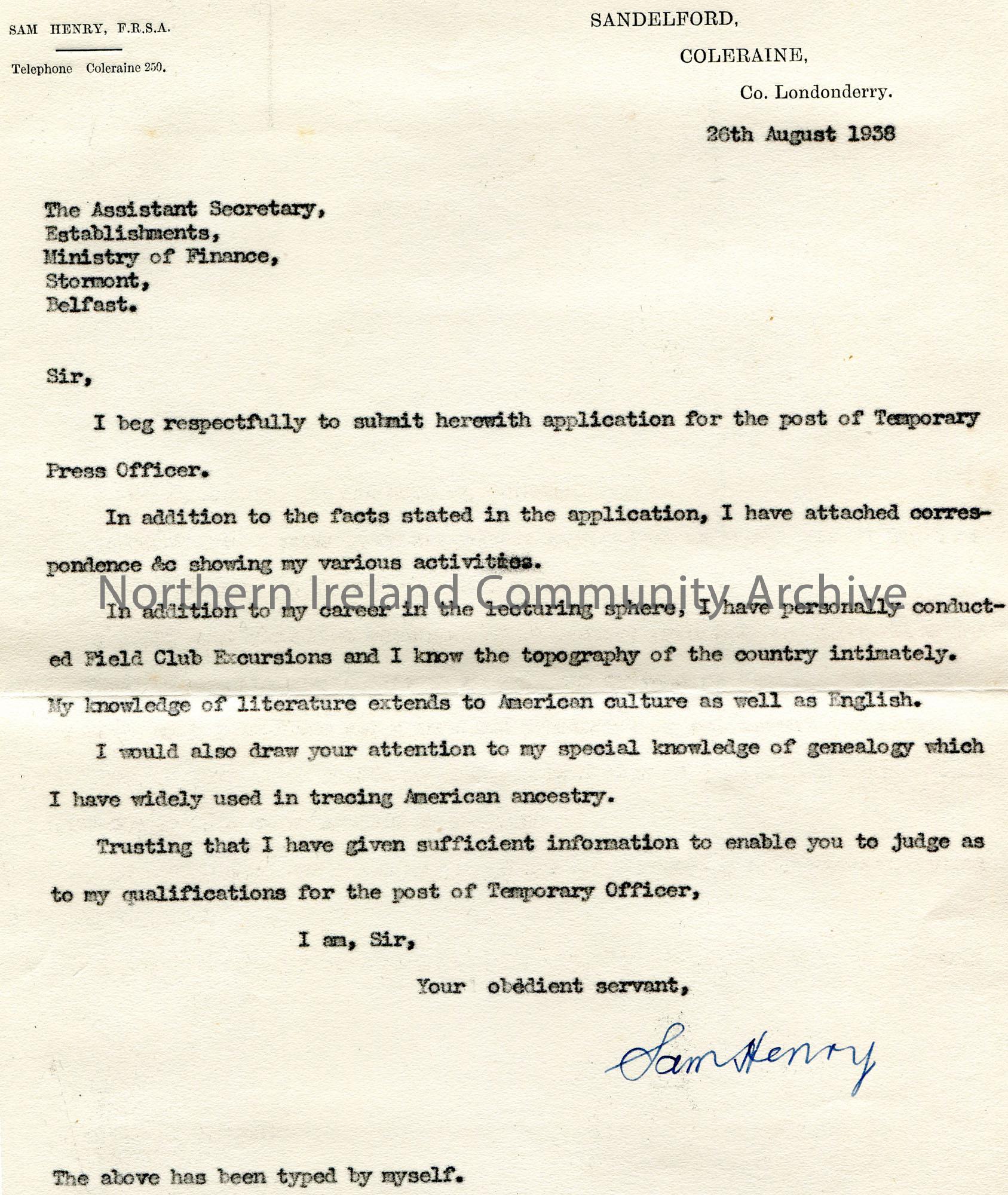 Typed letter to 'The Assistant Secretary, Establishments, Ministry of Finance, Stormont, Belfast. Sam is submitting his application and attached correspondence for post of Temporary Press Officer at the New Ulster House.