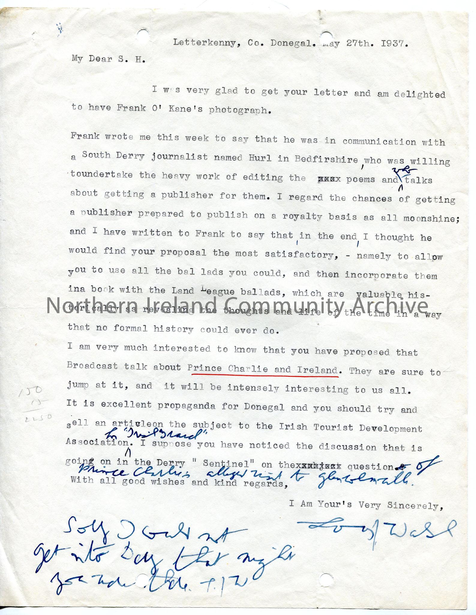Typed letter, with added notes in ink by author, Louis Walsh. Exchanging information on publication of book of poems and talks, and commenting on Sam's proposal for a broadcast about Prince Charlie and Ireland.