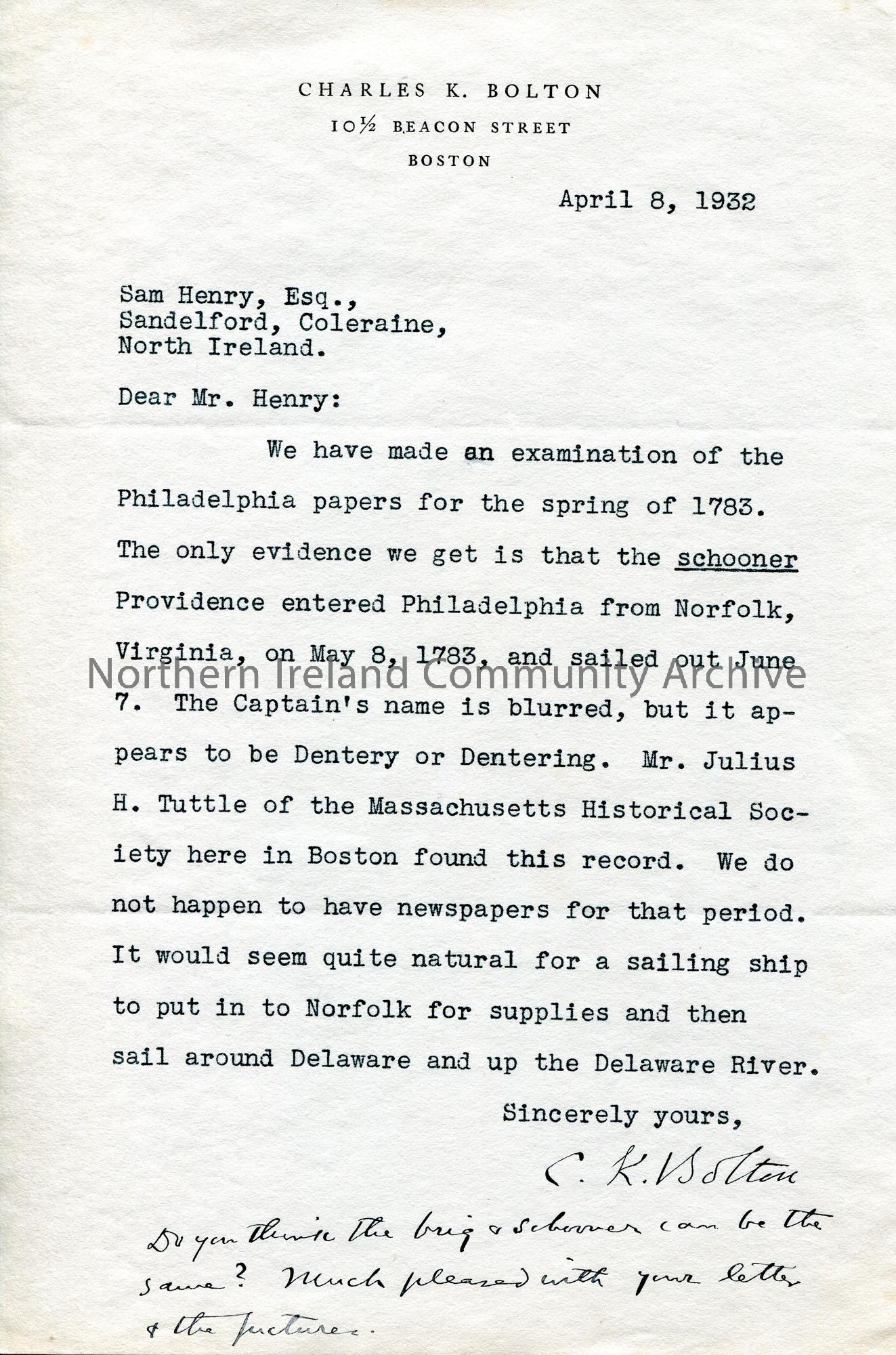 Typed letter with handwritten note at bottom to Sam Henry from C. K . Bolton. Searched Philadelphia papers for Sam, Spring 1783 and found record of a schooner 'Providence' having entered Philadelphia from Norfolk. Thanks Sam for the letter and picture.