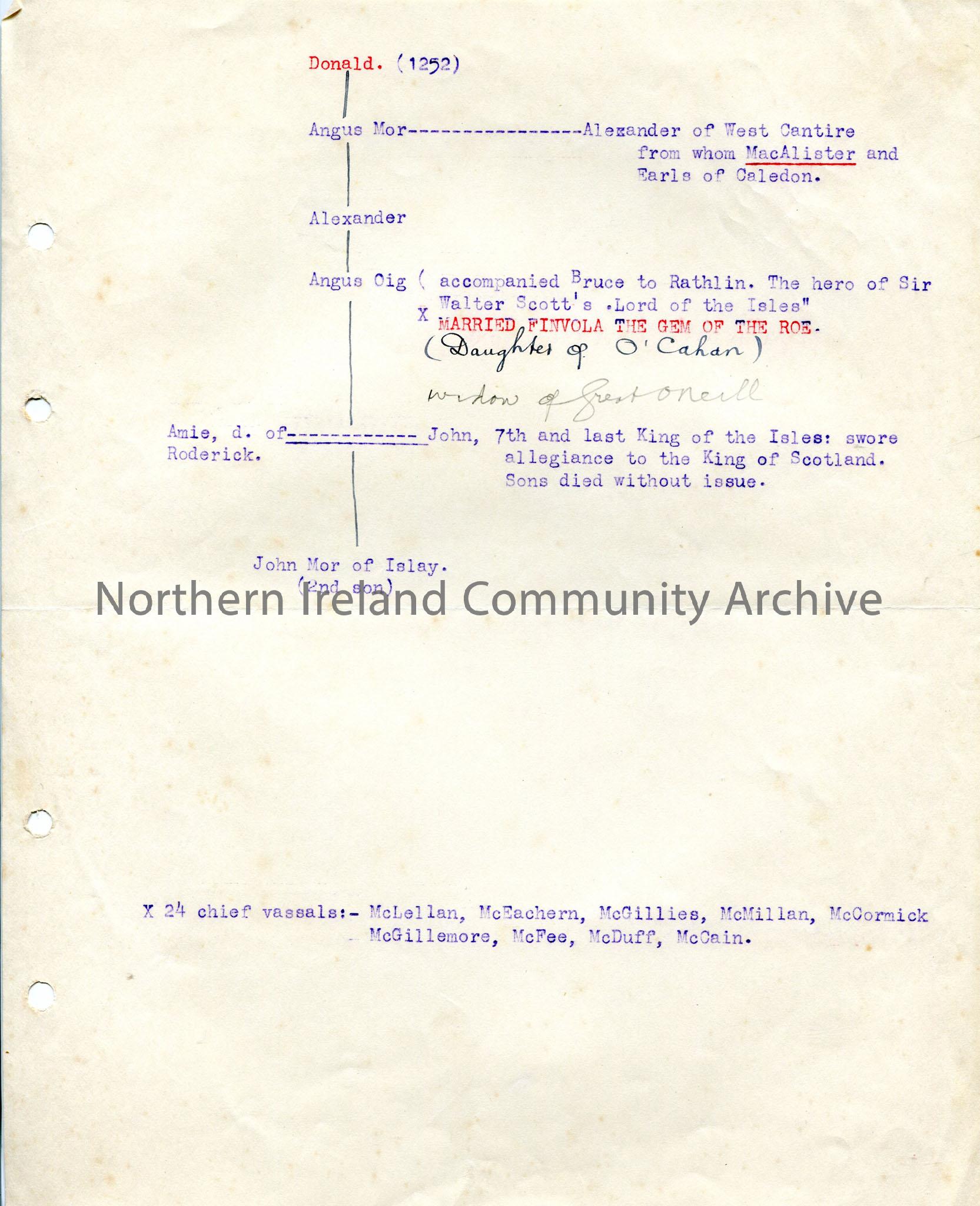 Typed line of descent for ? Kings of the Isles in Scotland, including link to O’Cahans.