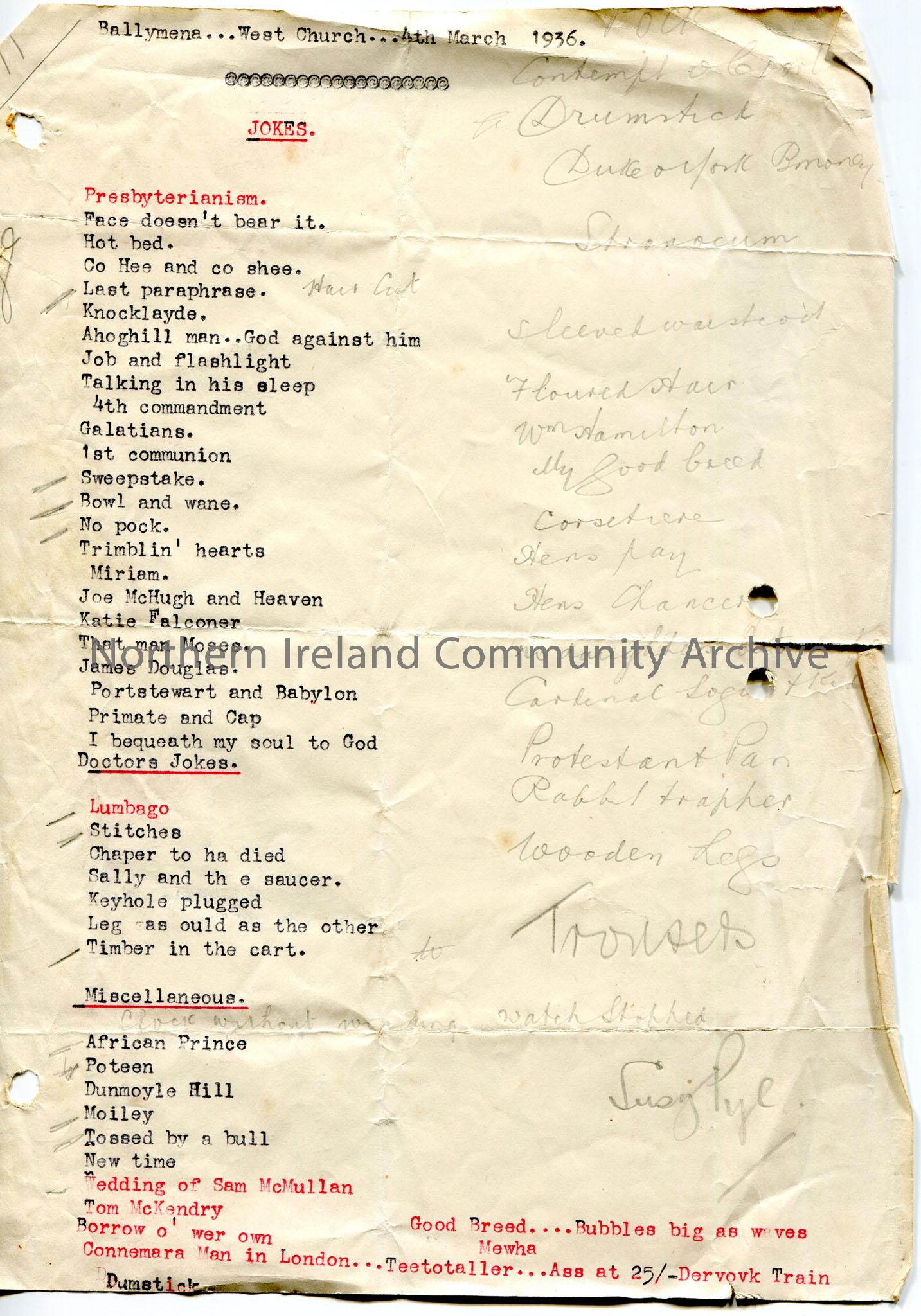 Typed list and handwritten list of jokes for lecture in Ballymena, West Church on 4th March 1936. List of place names written on back of page in penci…