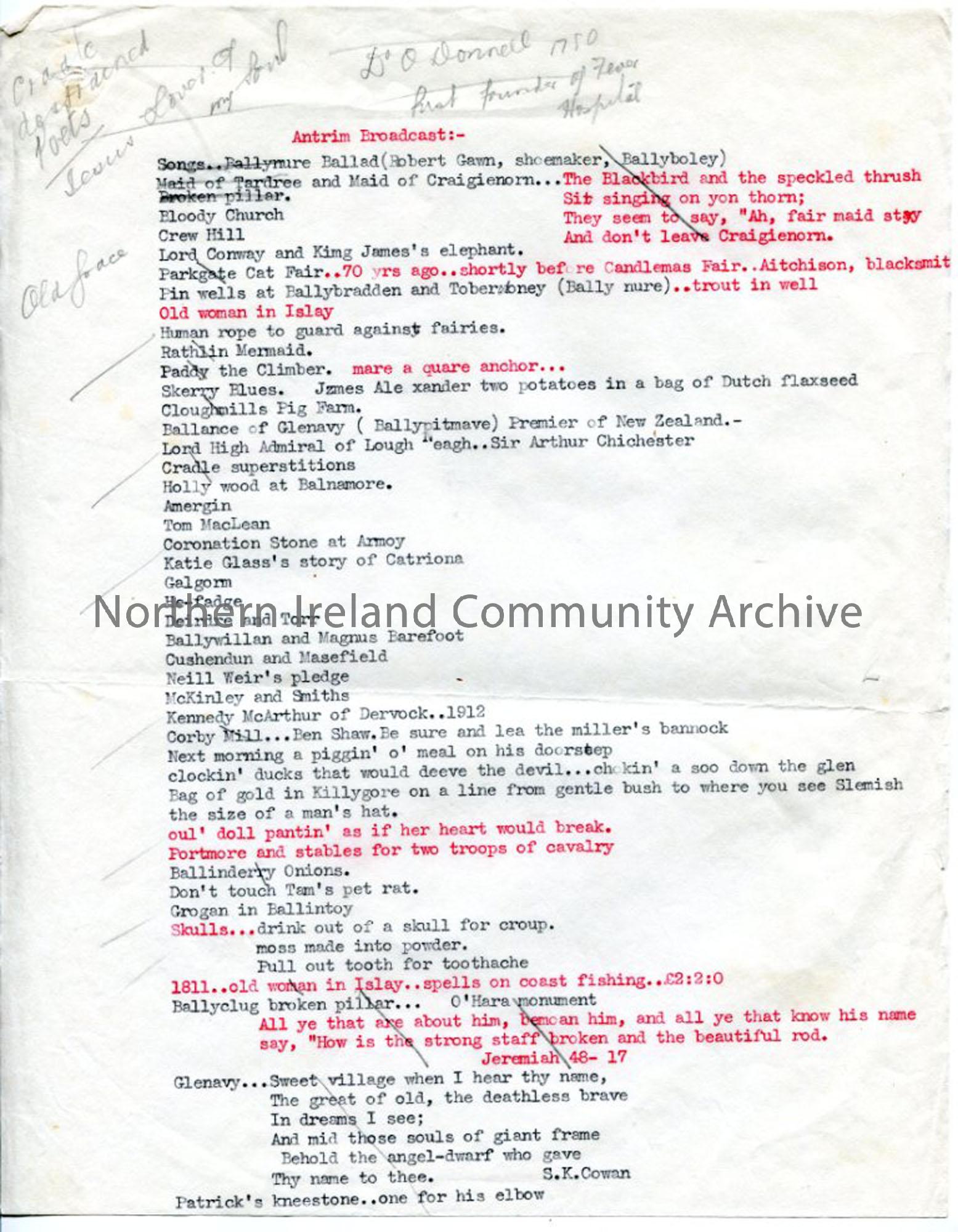 Under heading 'Antrim Broadcast', Typed list of titles to songs and stories, with handwritten additions -some recognisable from 'Undiscovered Ulster - County Antrim' script.