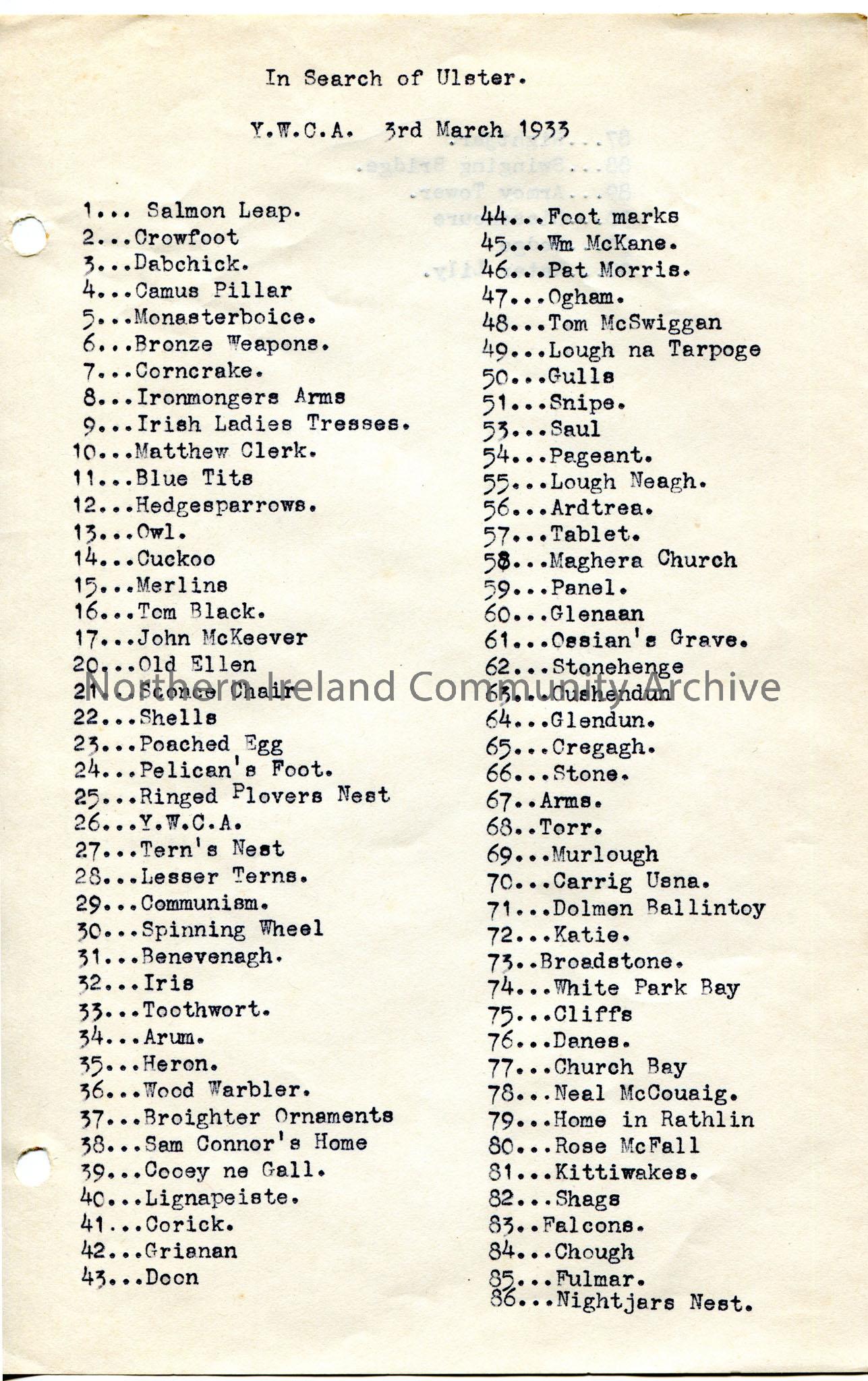 Typed list, (double sided), possibly slides to go with a lecture, titled, ‘In Search of Ulster. Y.W.C.A. 3rd March 1933’. Numbered 1-92.