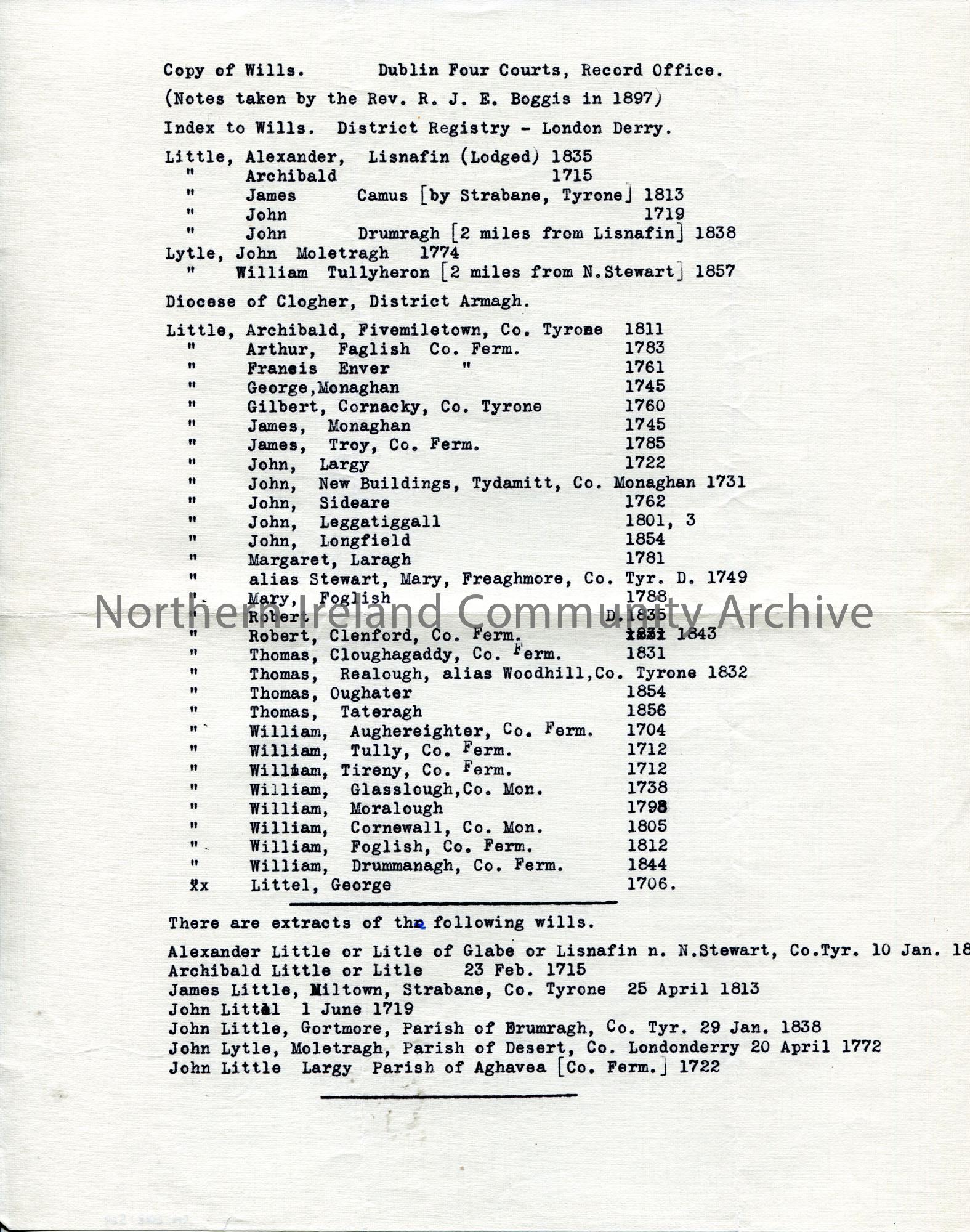 Typed list Index of Wills for surname Little. Titled, 'Copy of Wills. Dublin Four Courts, Record Office. (Notes taken by the Rev. R. J . E. Boggis in 1897). Index to Wills, District Registry - London Derry'.