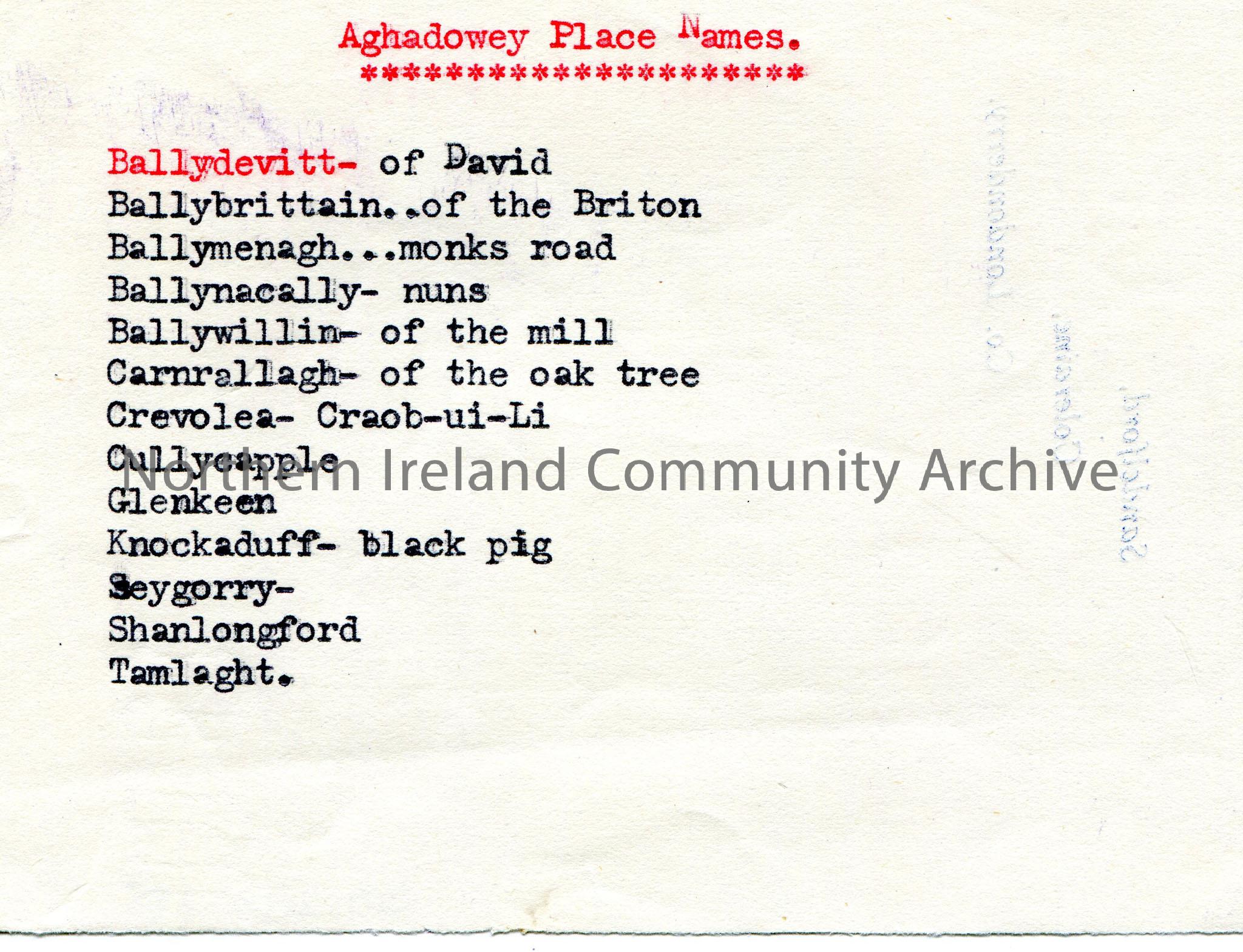 Typed list of Aghadowey Place Names in alphabetical order. Sandelford, Coleraine, Co.Londonderry on reverse.