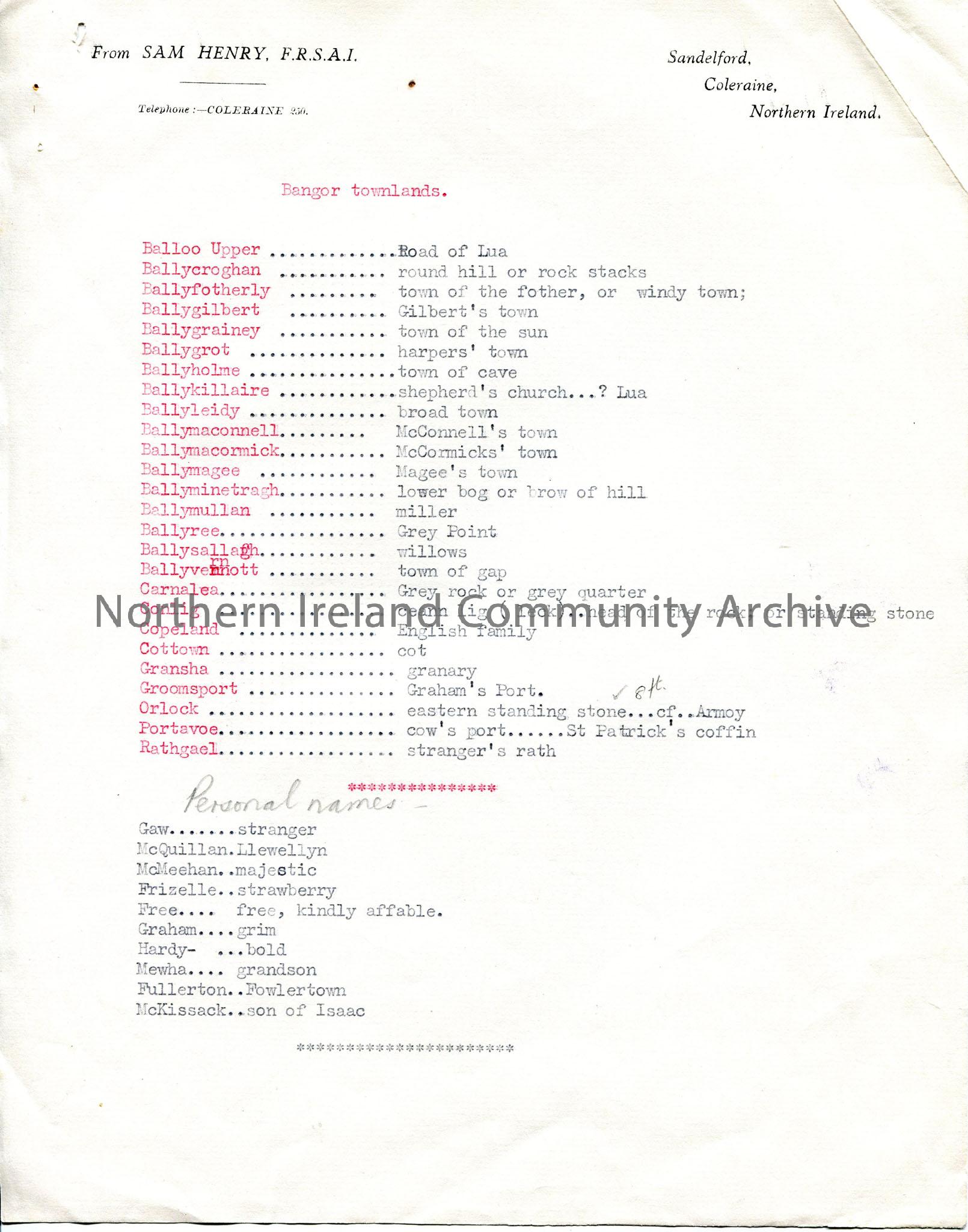 Typed list of Bangor townlands and their meaning, and personal names and thier meaning