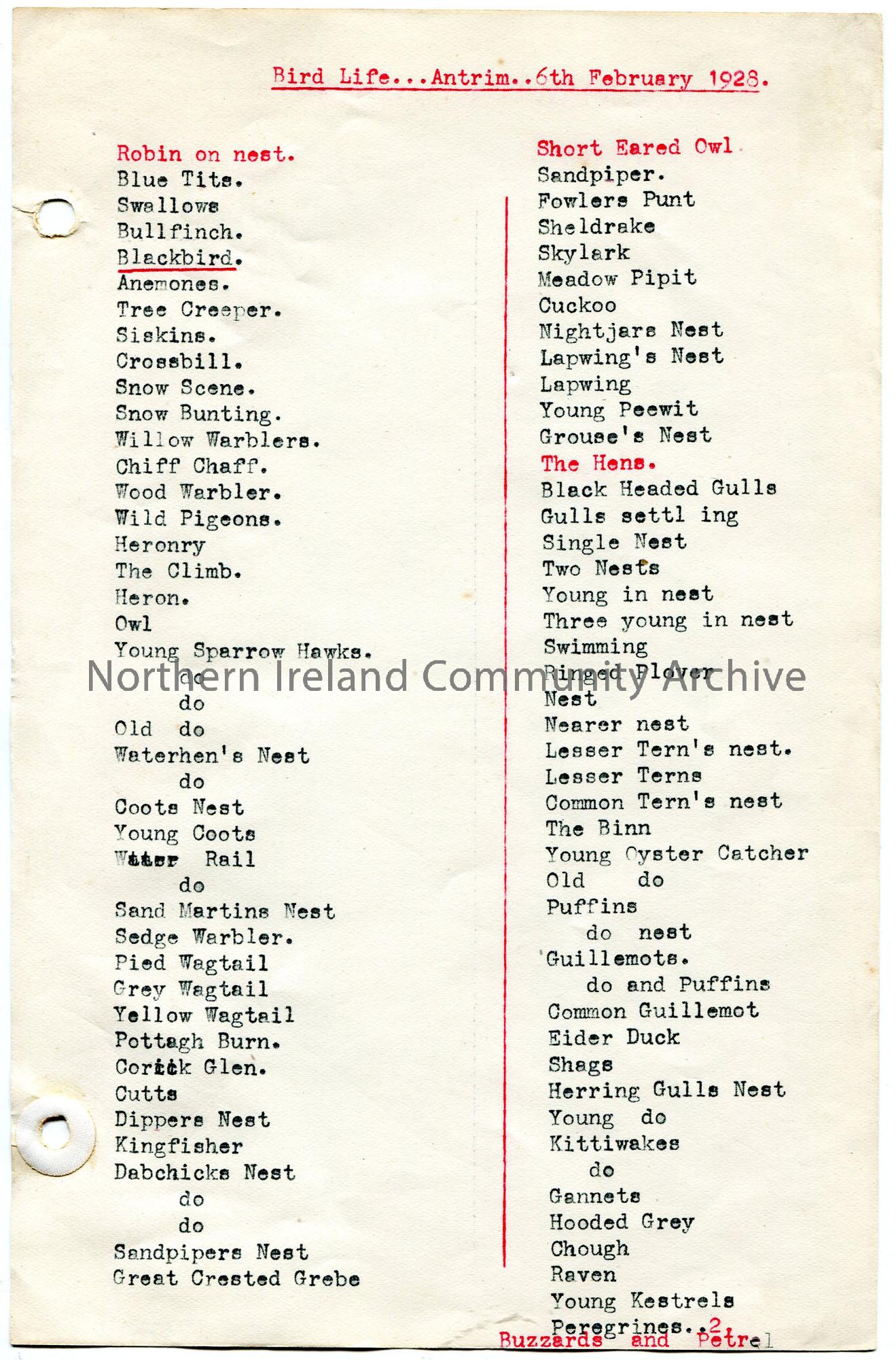 Typed list of bird names possibly slides for a lecture or talk 'Bird Life' in Antrim on 6th February 1928. Begins with Robin on nest and ends with Buzzards and Petrel.