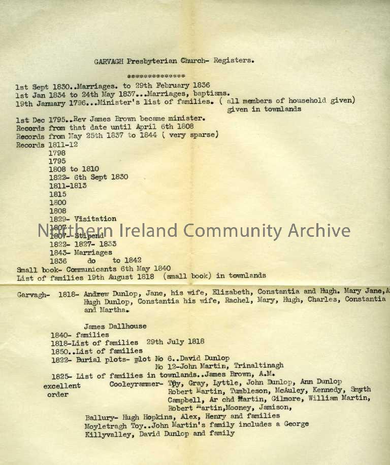 Typed list of extracts from Garvagh Presbyterian Church registers 1795-1843