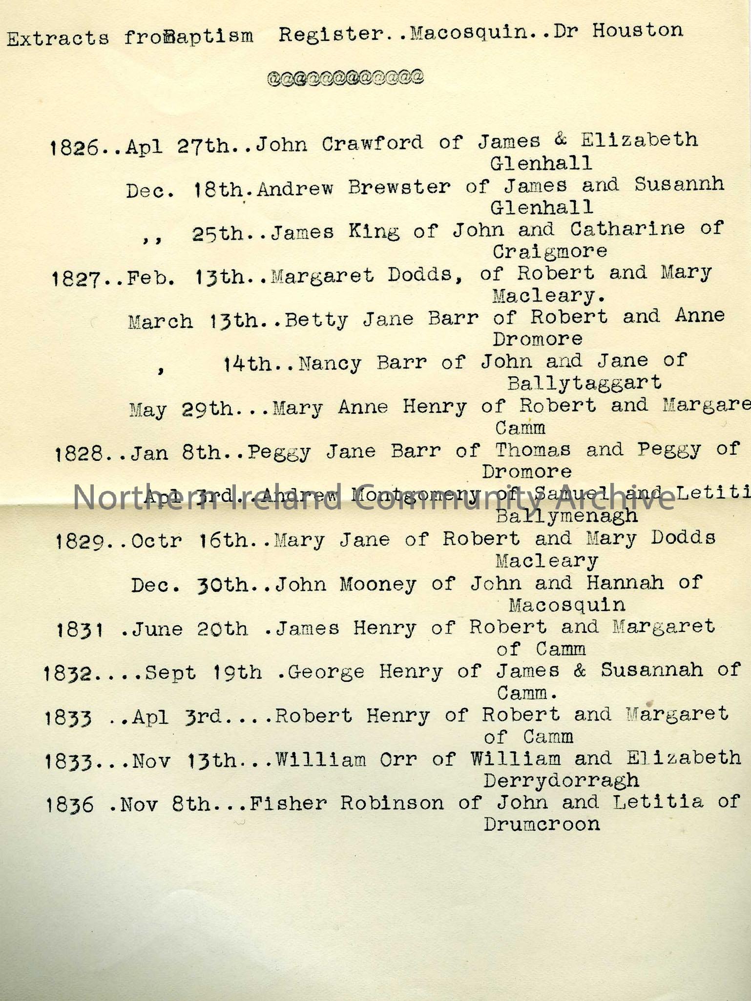 Typed list of extracts from Macosquin Baptism Registers 1820s and 1830s