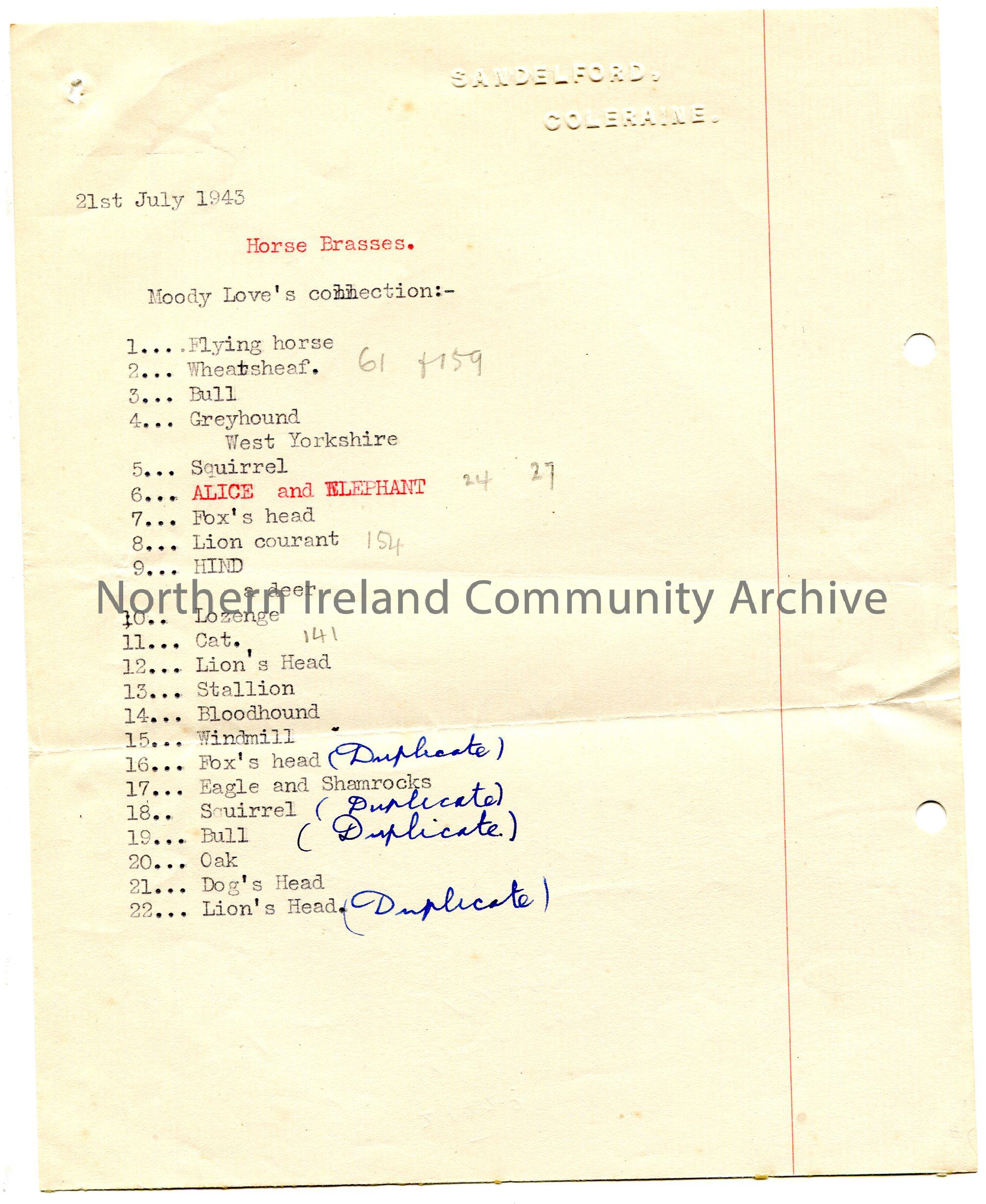 Typed list of horse brasses from Mr Moody Love's collection. Dated 21st July, 1943. List of 22. '21423 American Red Cross' handwritten in pencil on back of page.