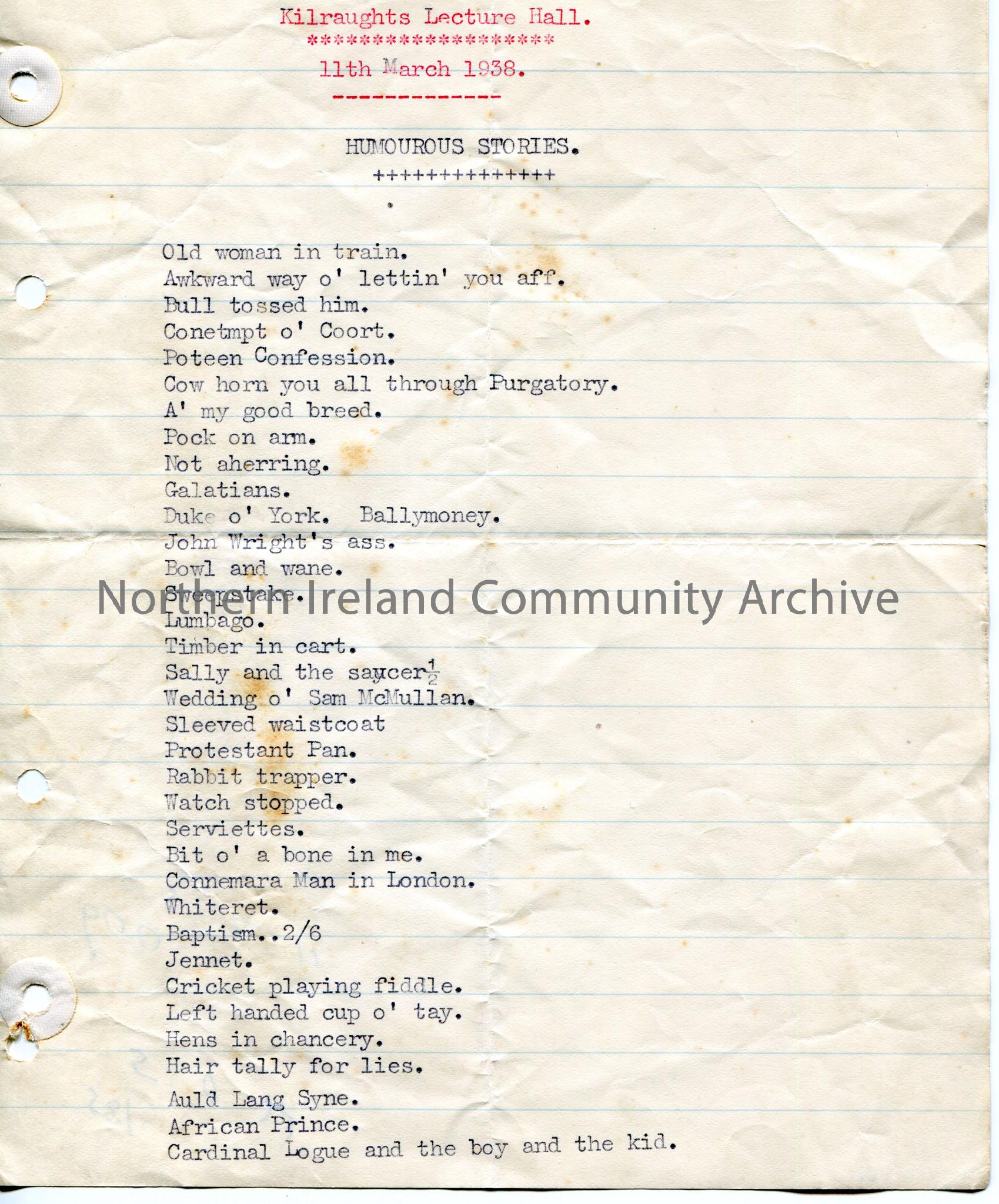 Typed list of humorous stories for lecture at Kilraughts Lecture Hall on 11th March, 1938. List begins with ‘Old woman in train’ and ends with ‘Cardin…
