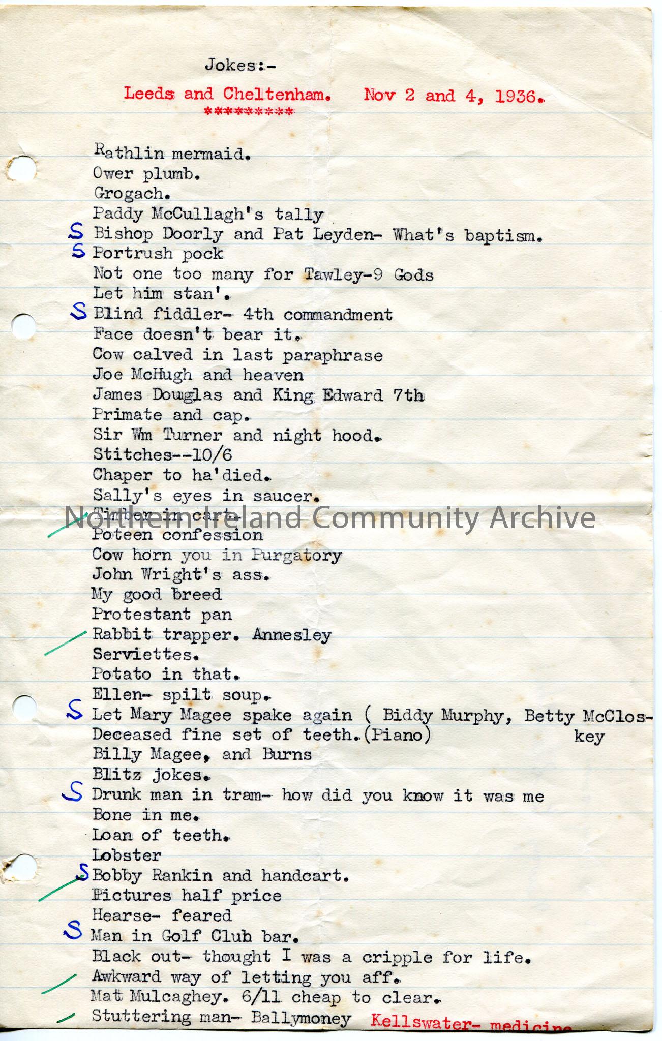 Typed list of jokes titled, ‘Jokes:- Leeds and Cheltenham’. Dated 2nd and 4th November, 1936.