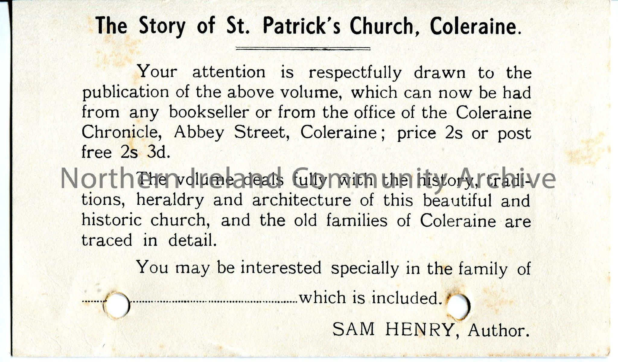 Typed list of names under 'sent', with pencilled heading 'cards'. Typed on reverse of printed details advertising 'The Story of St. Patrick's Church, Coleraine', by Sam Henry