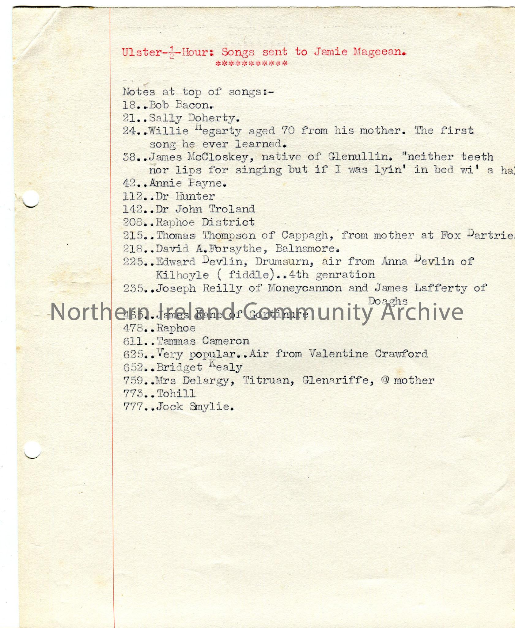 Typed list of notes with numbers, under heading ‘Ulster-1/2-Hour: Songs sent to Jamie Mageean’ and then ‘Notes at top of Songs