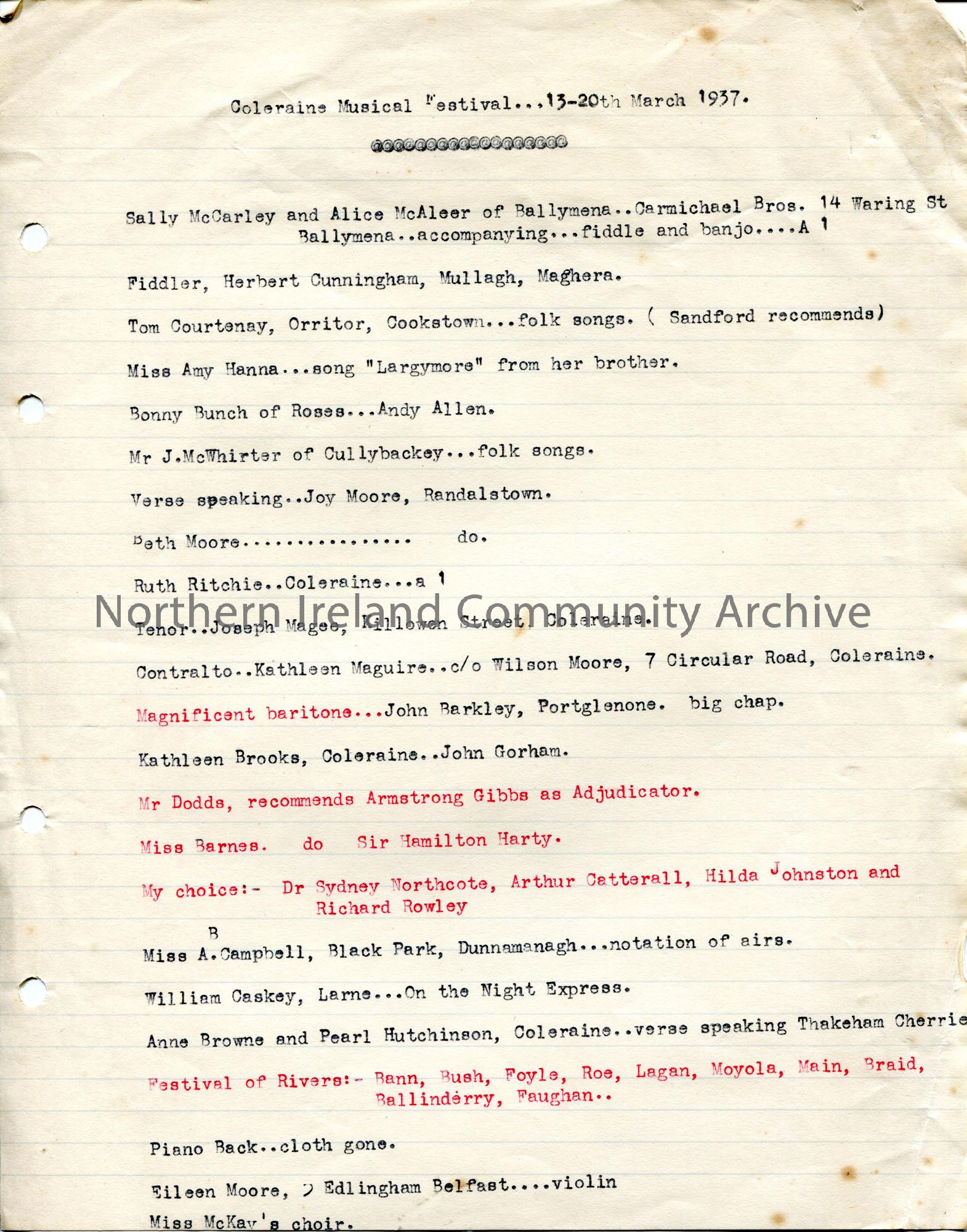 Typed list of participants and their performances at Coleraine Musical Festival 13th-20th March, 1937. Mentions names - Sally McCarley, Alice McAleer, Herbert Cunningham, Tom Courtenay, Amy Hanna, Andy Allen, J. McWhirter, Joy Moore, Beth Moore, Ruth Ritchie, Joseph Magee, Kathleen Maguire, Wilson Moore, John Barkley, Kathleen Brooks, A. Campbell, William Caskey, Anne Browne, Pearl Hutchinson, Eileen Moore.