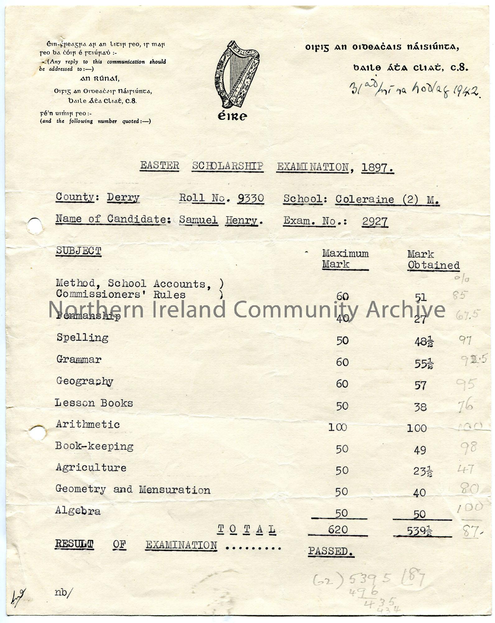 Typed list of school subjects and results of an Easter Scholarship Examination, 1897. Candidate - Samuel Henry, roll no. 9330, Coleraine Model School, exam no. 2927. Result - Passed. Percentage result of marks handwritten in pencil. Typed on headed paper re EIRE. Date of 1942 handwritten at top of page.