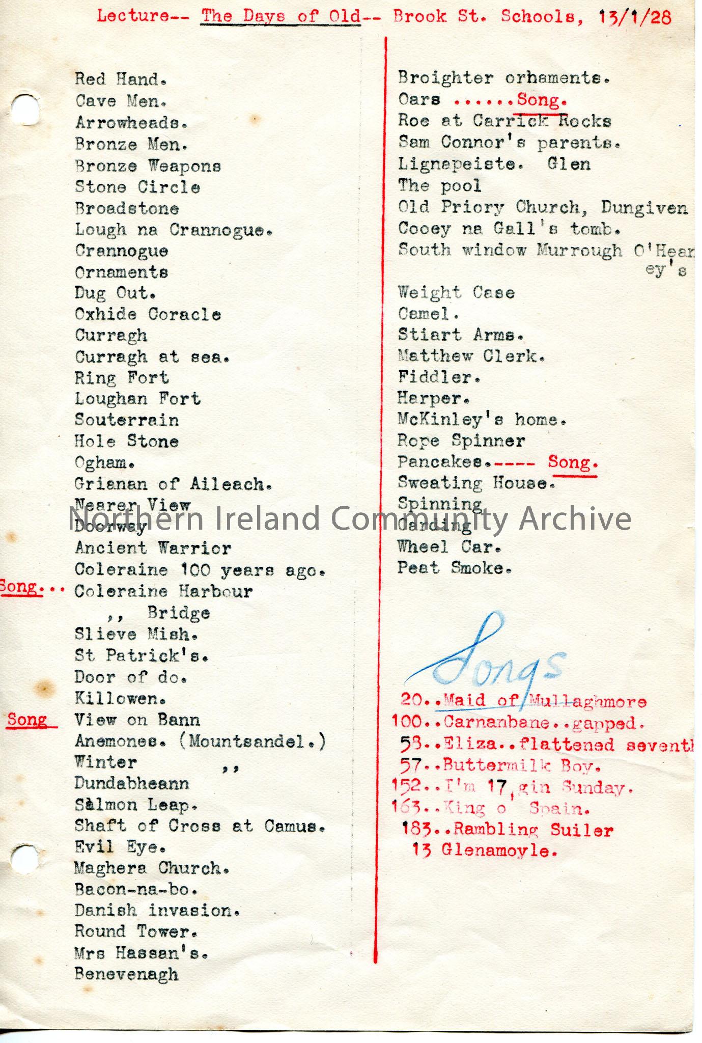 Typed list of slides and songs for lecture titled, 'The Days of Old', at Brook Street Schools on 13th January, 1928. The list of slides begins with 'Red Hand' and ends in 'Peat Smoke'.