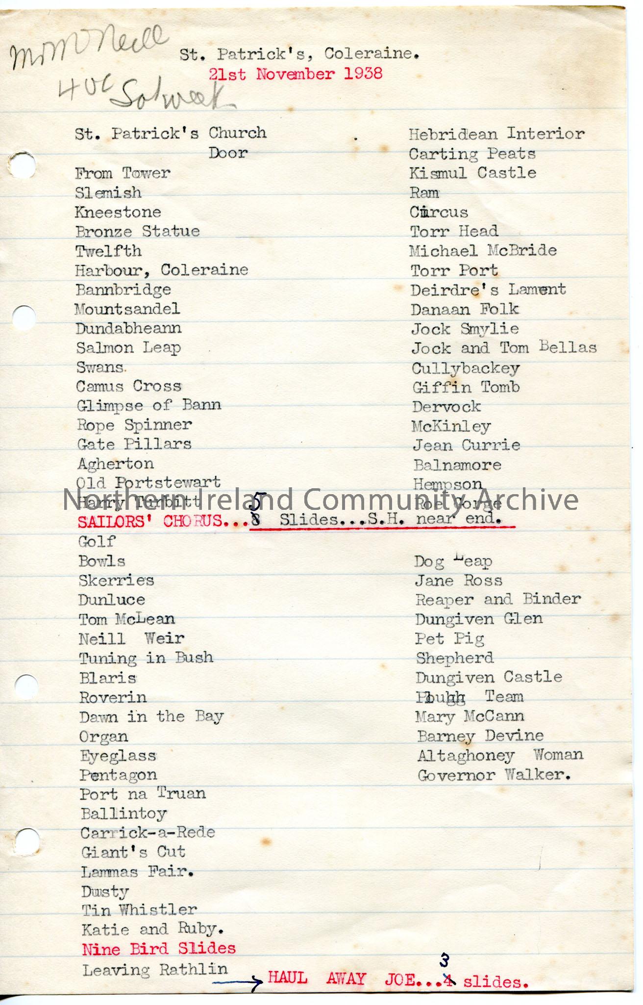 Typed list of slides for a lecture at St. Patrick’s, Coleraine on 21st November, 1938. Begins with ‘St.Patrick’s Church Door’ and ends with ‘Governor …