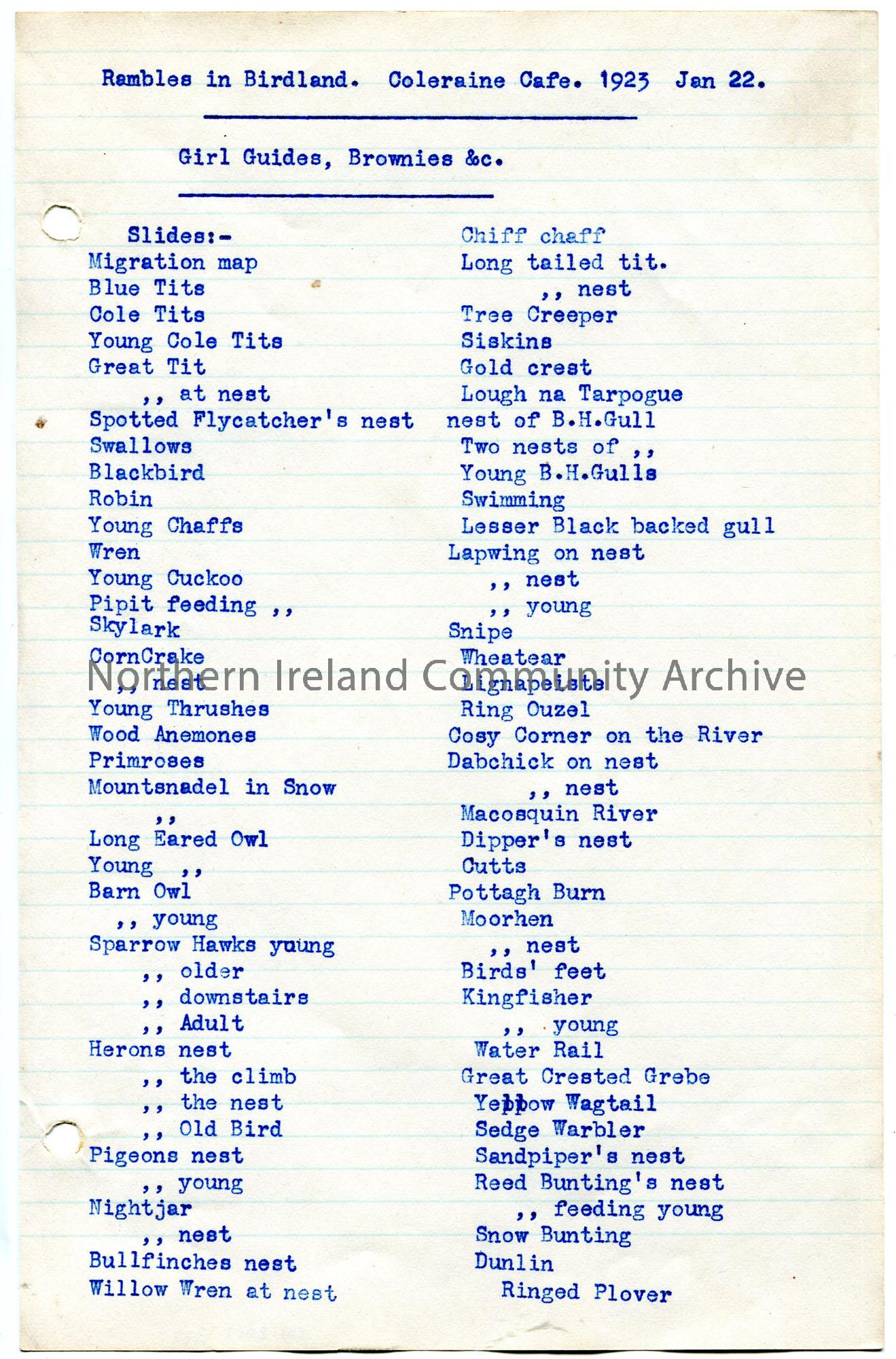 Typed list of slides for a what appears to be a lecture or talk titled, ‘Rambles in Birdland’. In Coleraine Cafe on 22nd January, 1923 for the Girl Gu…