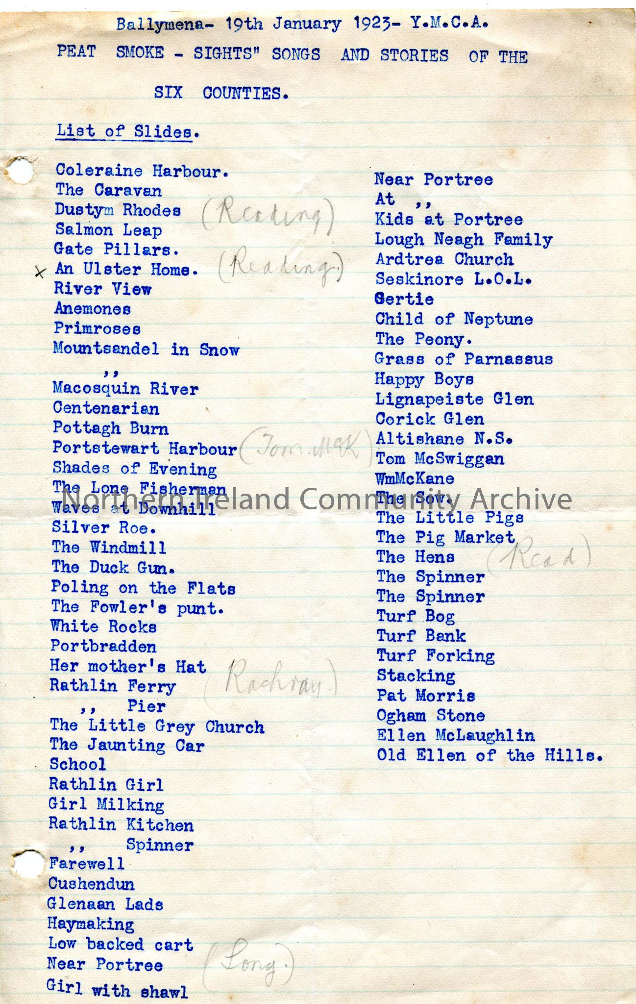 Typed list of slides on lined paper. Titled 'Ballymena - 19th January 1923 - Y.M.C.A. Peat Smoke - Sights Songs and Stories of the Six Counties'. Some slides annotated with 'Reading', 'Tom McK' and 'song' handwritten beside them. Slides mention places of - Coleraine, Mountsandel, Macosquin, Portstewart, Downhill, Portbradden, Rathlin, Cushendun, Portree, Lough Neagh.