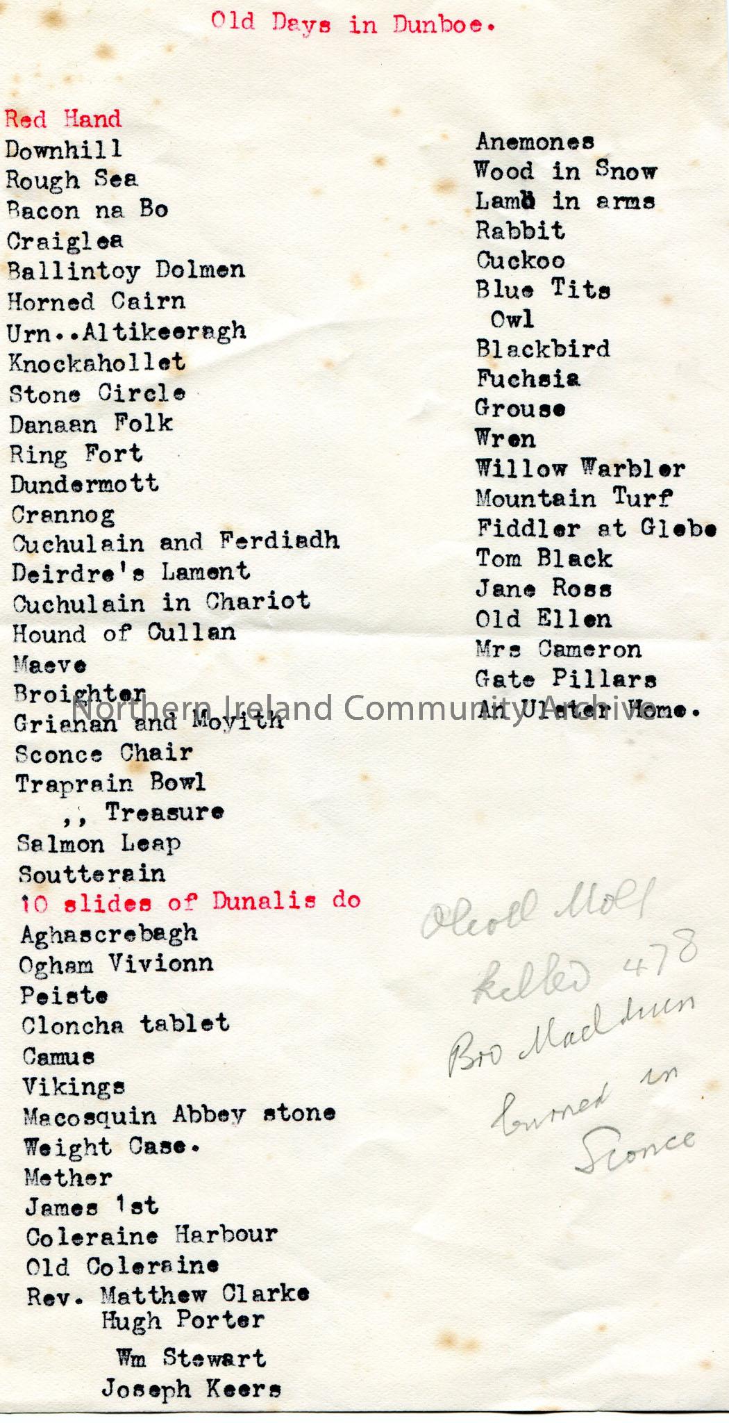 Typed list of slides titled, ‘Old Days in Dunboe’. List begins with ‘Red Hand’ and ends with ‘An Ulster Home’.