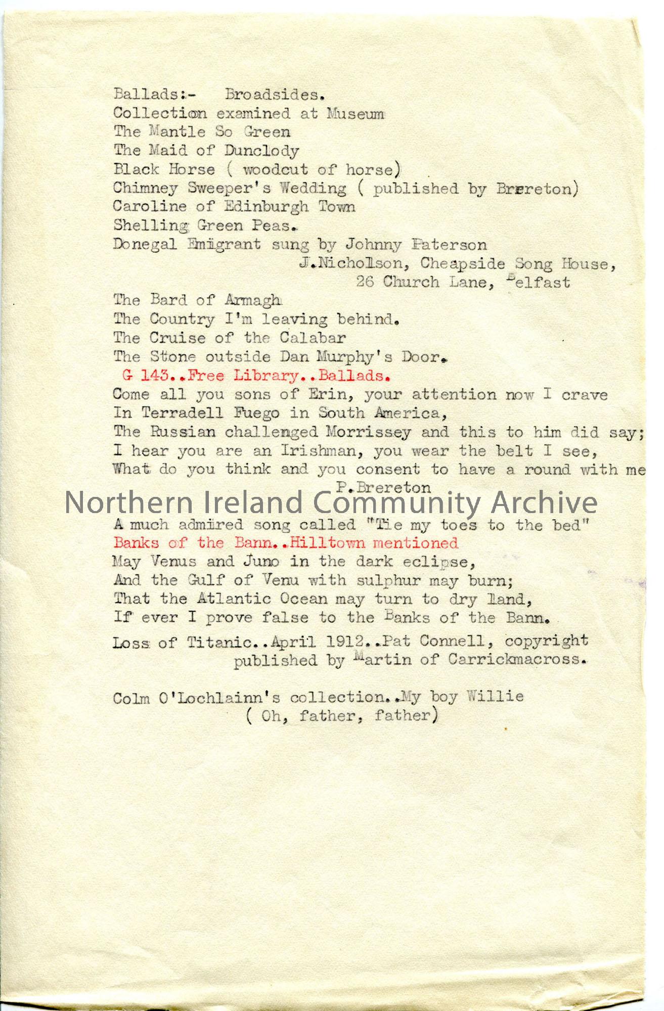 Typed list of song titles – ‘Ballads’.