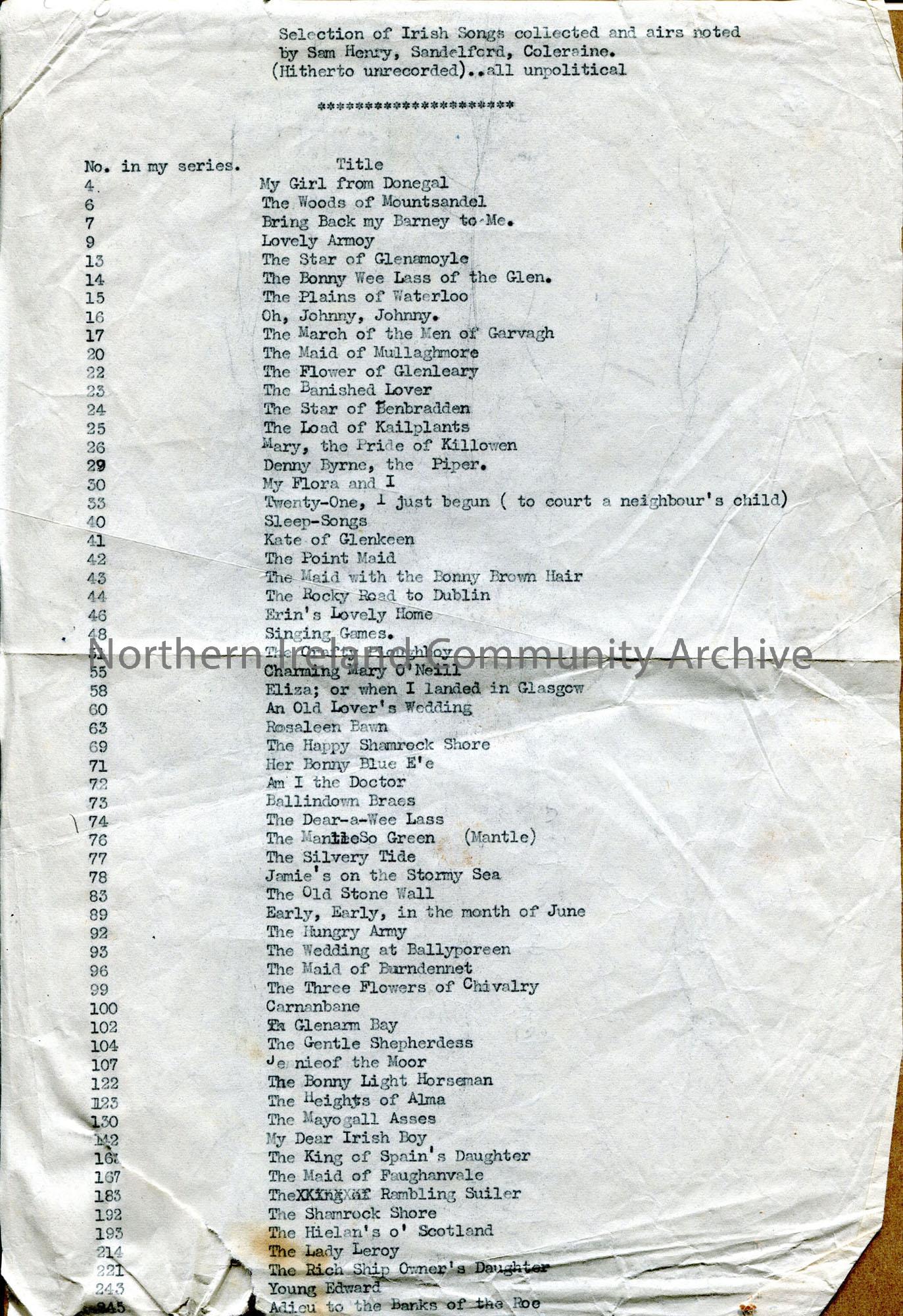 Typed list of song titles in numerical order but not complete run. In heading says ‘(hitherto unrecorded…all unpolitical’
