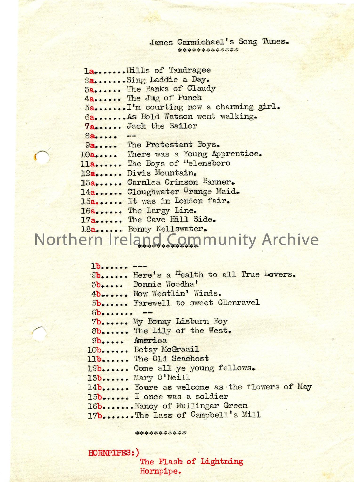 Typed list of song titles – ‘James Carmichael’s Song Tunes’