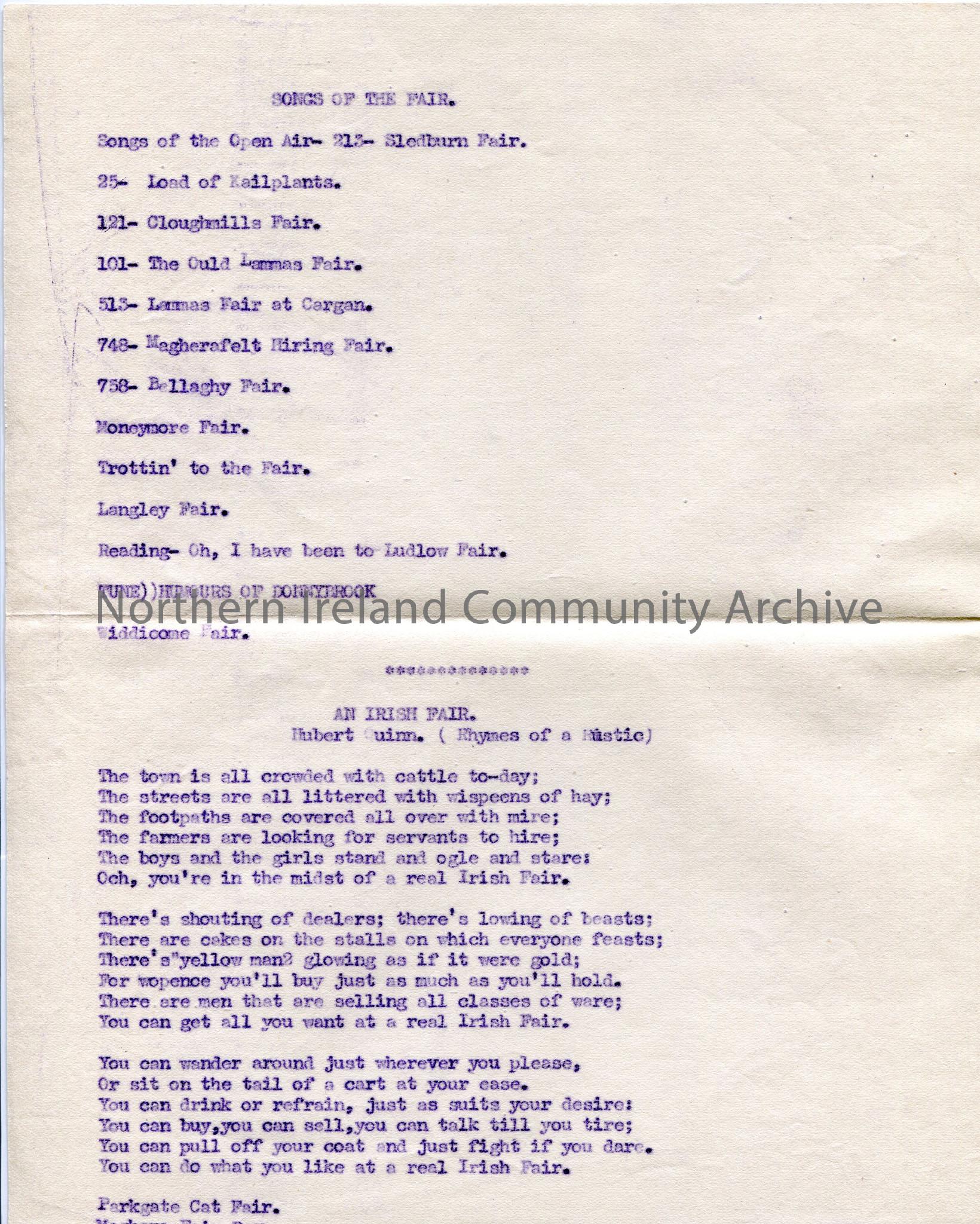 Typed list of song titles under the heading ‘Songs of the Fair’ and words to song ‘An Irish Fair’. Carbon copy