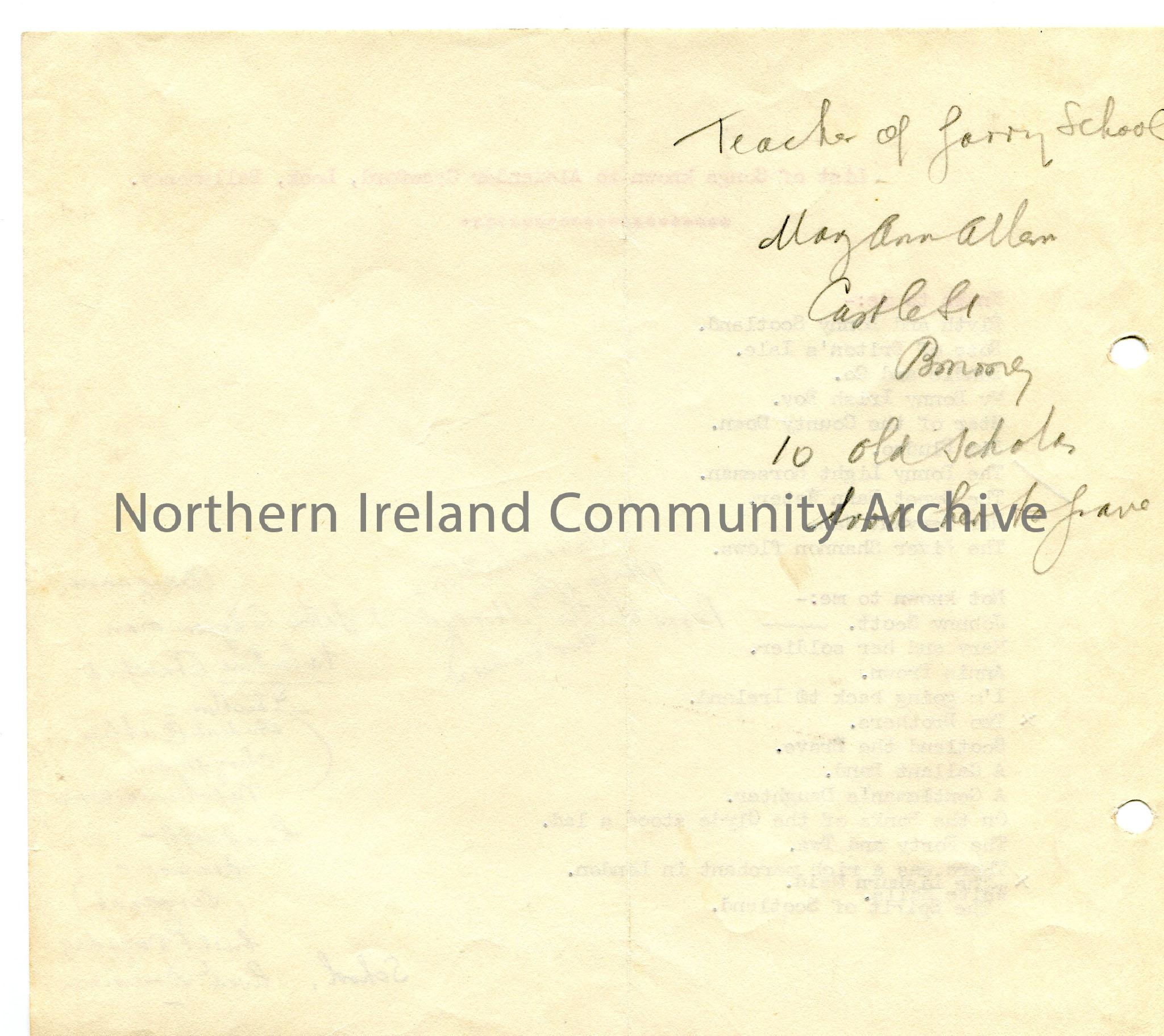 Typed list of songs known to Alexander Crawford of Leck, Ballymoney - divided into 2 lists - 'Known to me' and 'Not known to me'. There are handwritten notes on both sides of genealogical interest re various people - their relations, location, jobs
