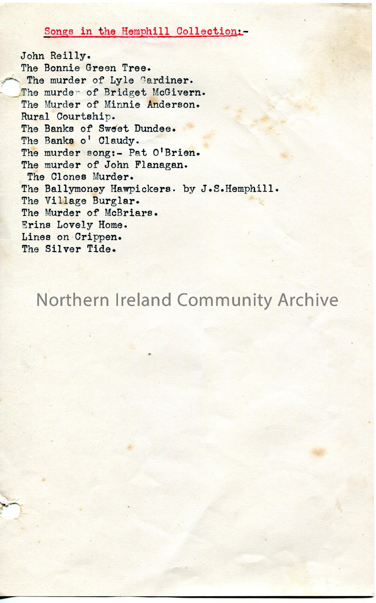 Typed list of songs titled, ‘Songs in the Hemphill Collection’. Seventeen songs. Seven of the songs has ‘murder’ in the title. Begins with ‘John Reill…