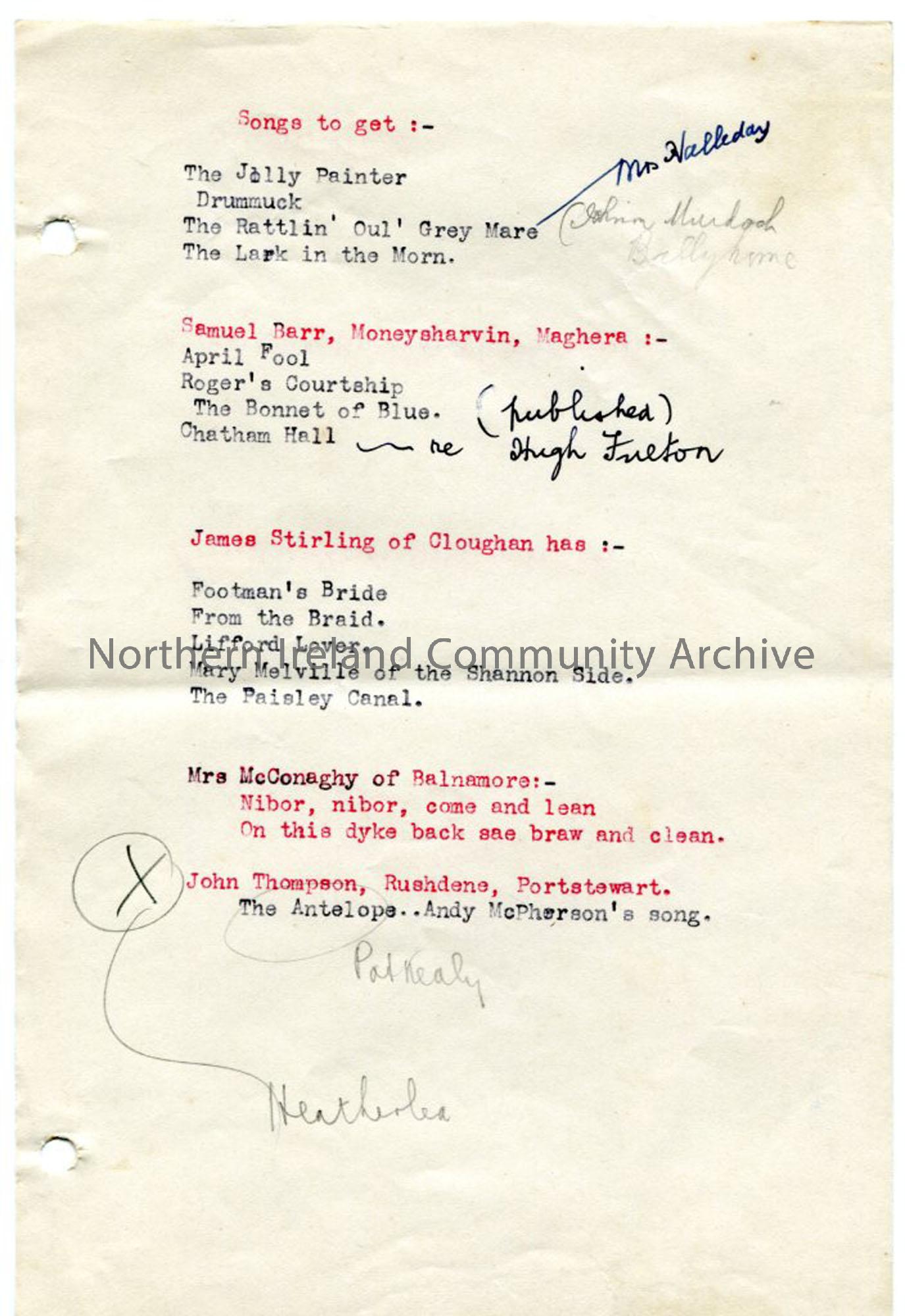 Typed list of 'Songs to get' and names with songs entered against them.