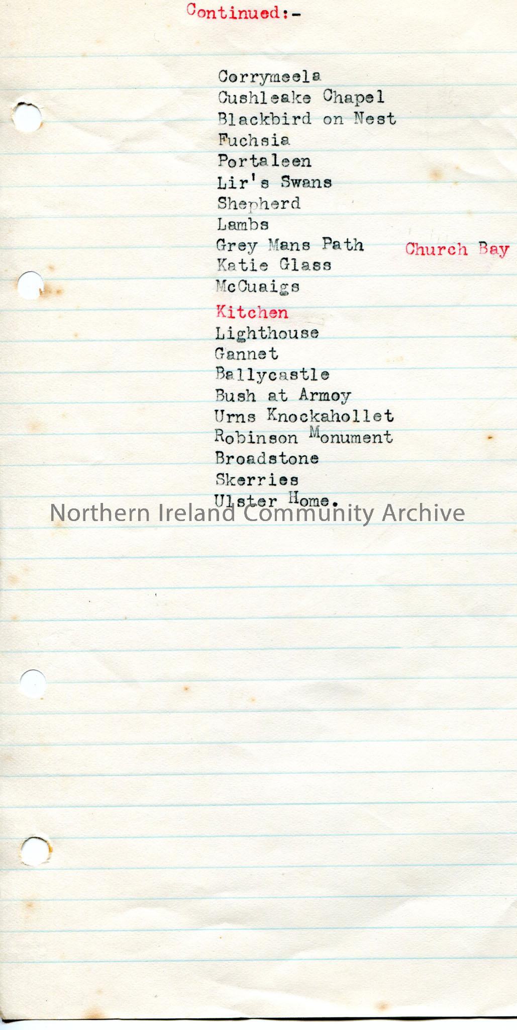Typed list of topics continued from another page which is missing. List begins with Corrymeela and ends with Ulster Home. Possible topics for lecture or names of slides.