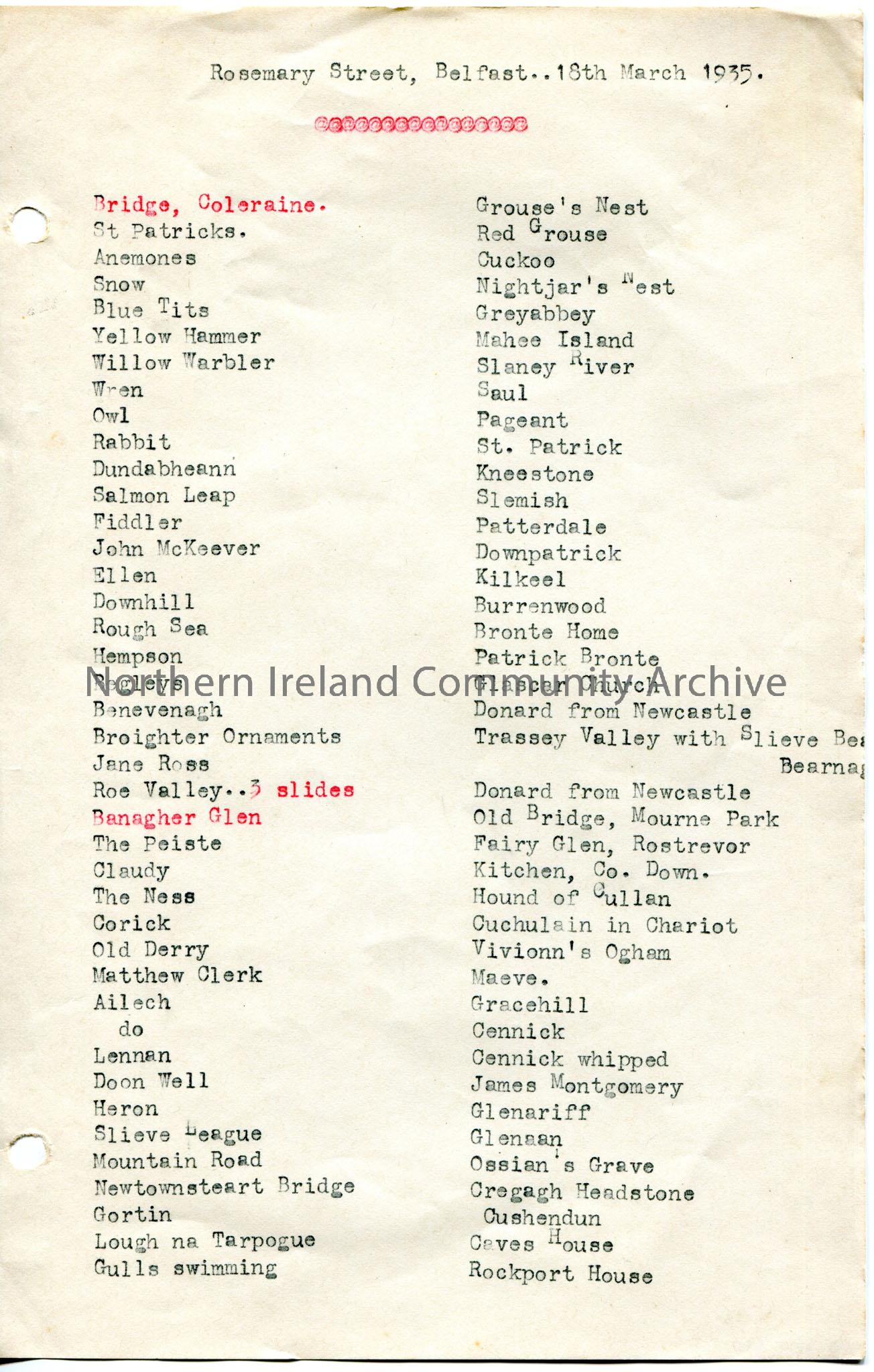 Typed list of topics for lecture at Rosemary Street, Belfast on 18th March, 1935. Possibly a list of slides for the lecture. The list is mostly re placenames.