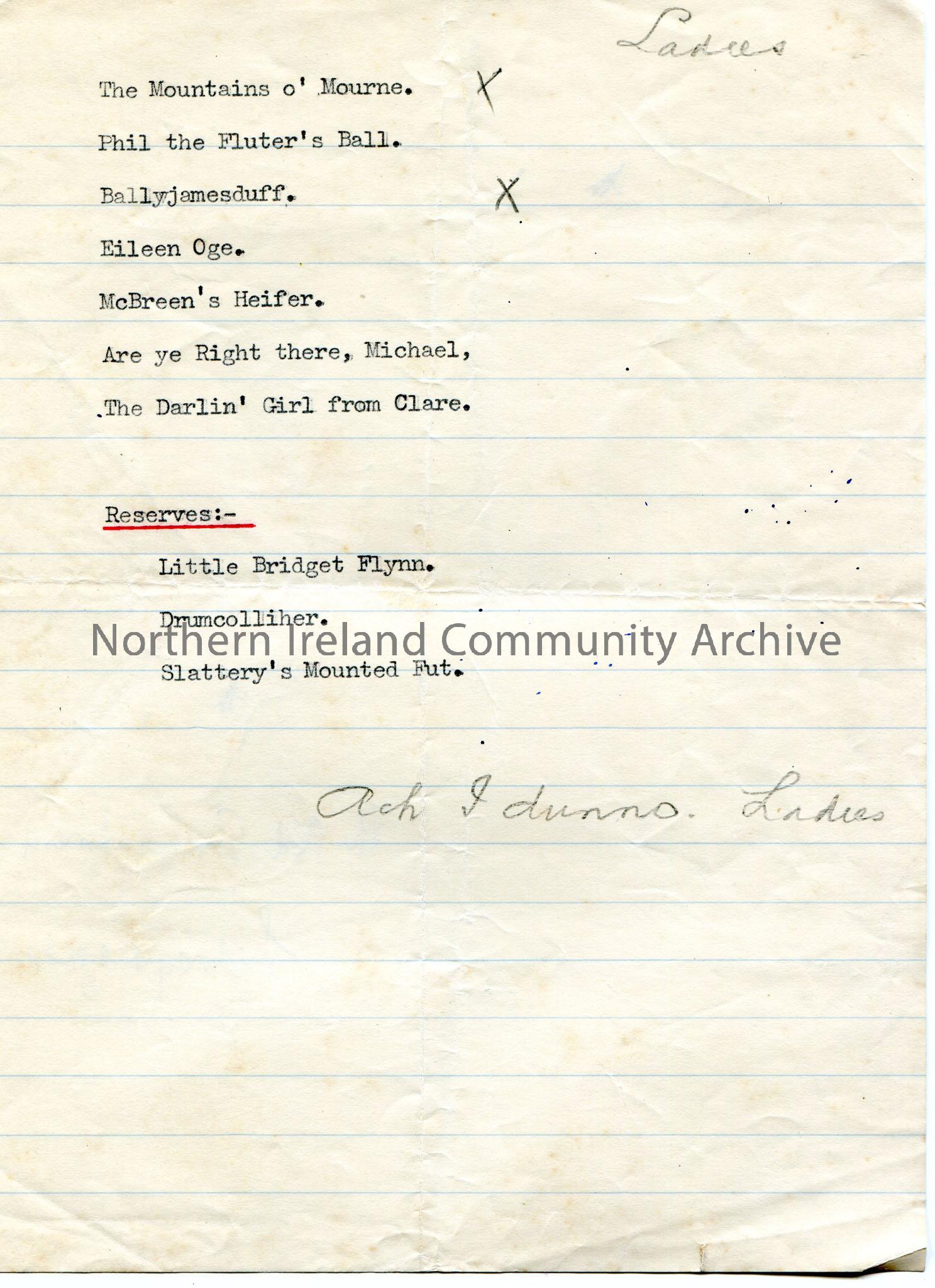 Typed list on a lined page re songs by Percy French. ‘The Old Enchantment, Sydney Rogerson’ written on other side in pencil.