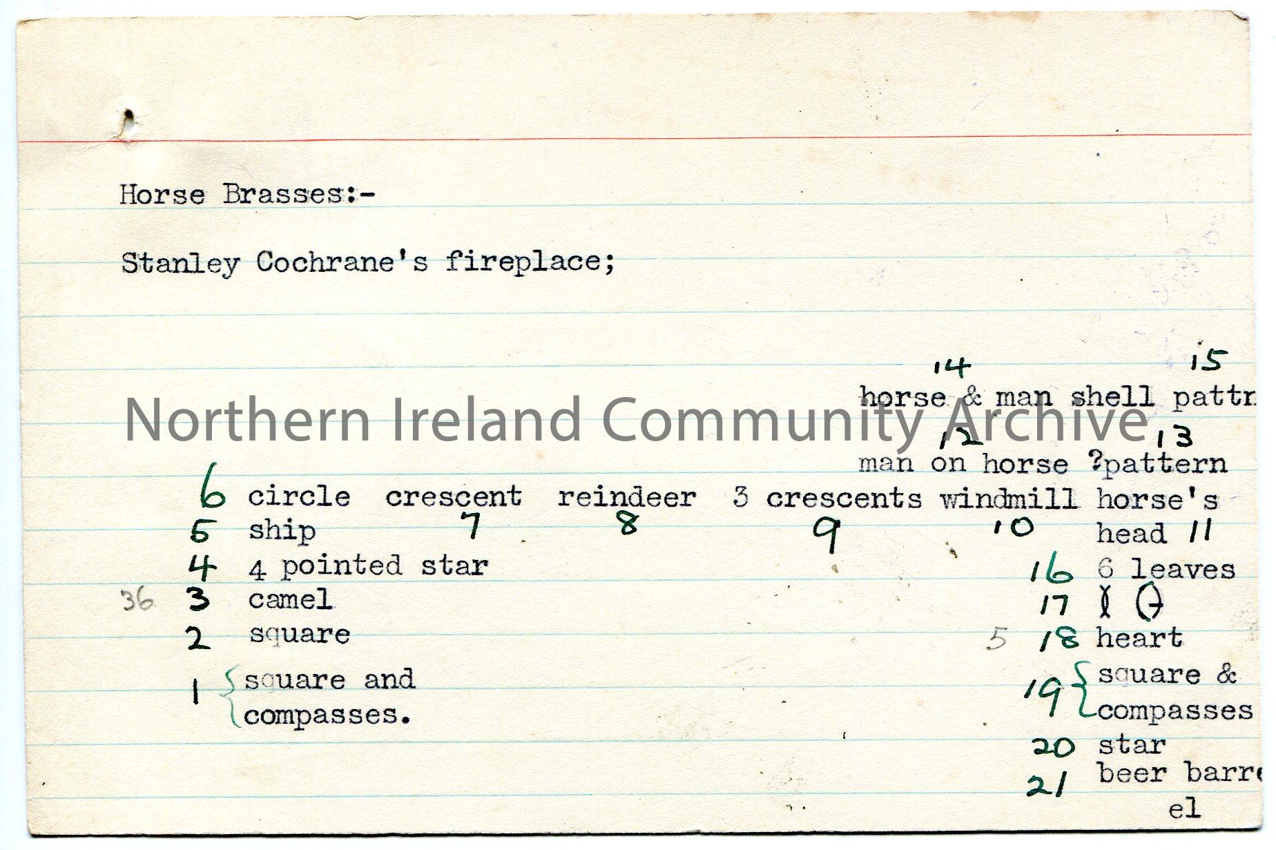 Typed list on lined card of horse brasses from Stanley Cochrane’s fireplace. Numbered 1-21 in green ink. Verse typed on back of card re marriage of Mr…