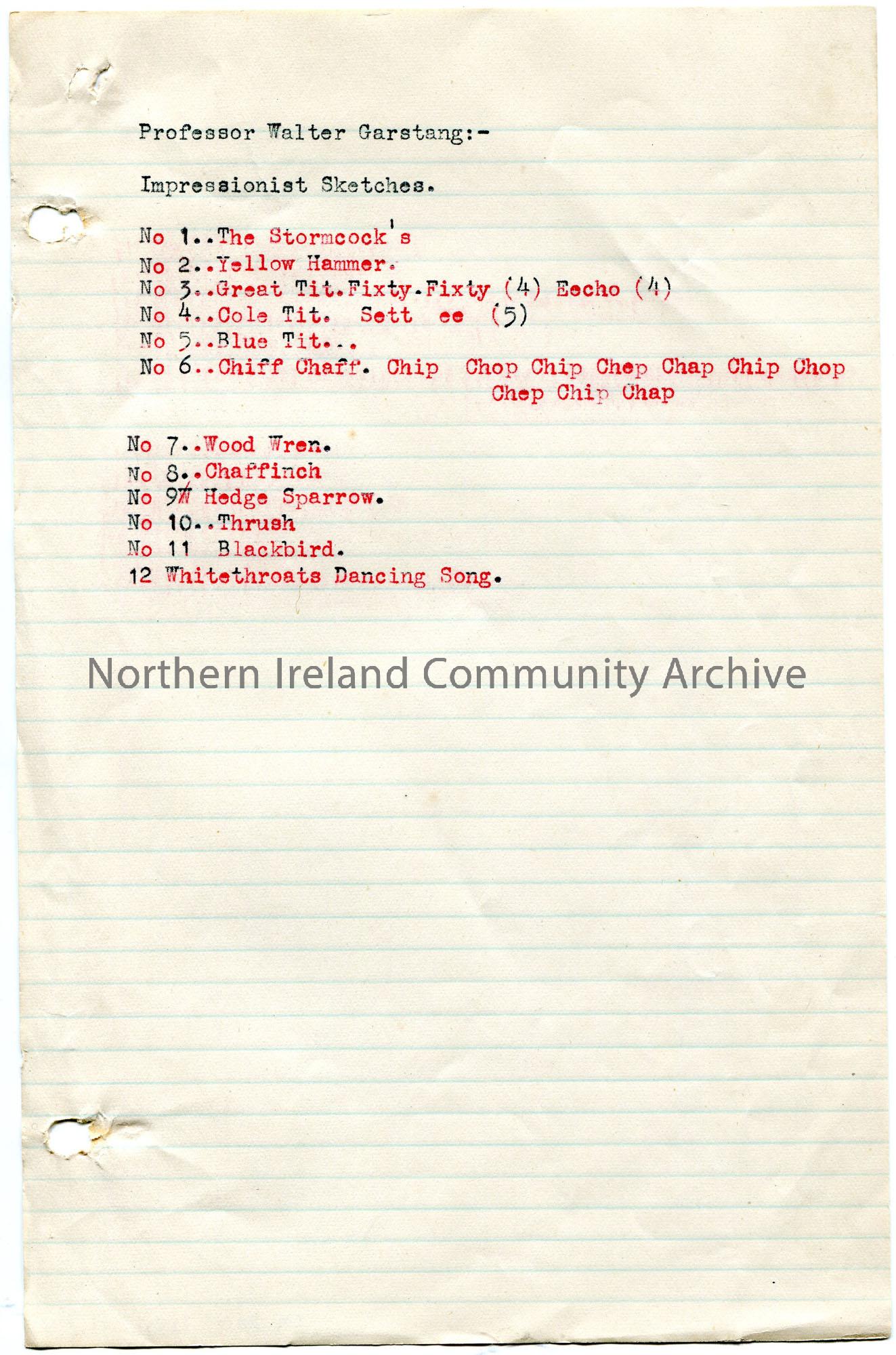 Typed list on lined paper headed, ‘Professor Walter Garstang:- Impressionist Sketches’. Re birds.