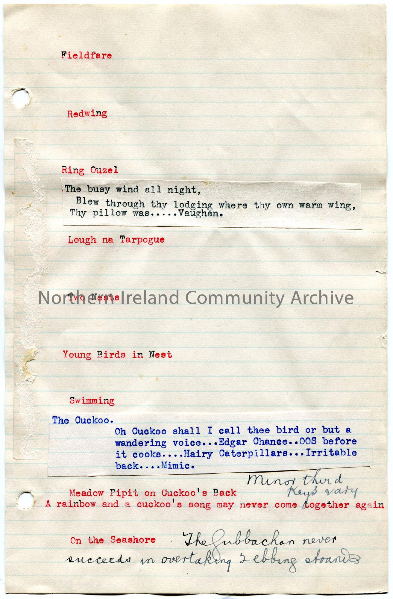 Typed list on lined paper of names of bird and notes relating to that particular bird. Possibly preparation for a lecture or talk on birds. Notes re Ring Ouzel and cuckoo which have been typed on paper and stuck to this page. Other handwritten notes re Gubbachan.