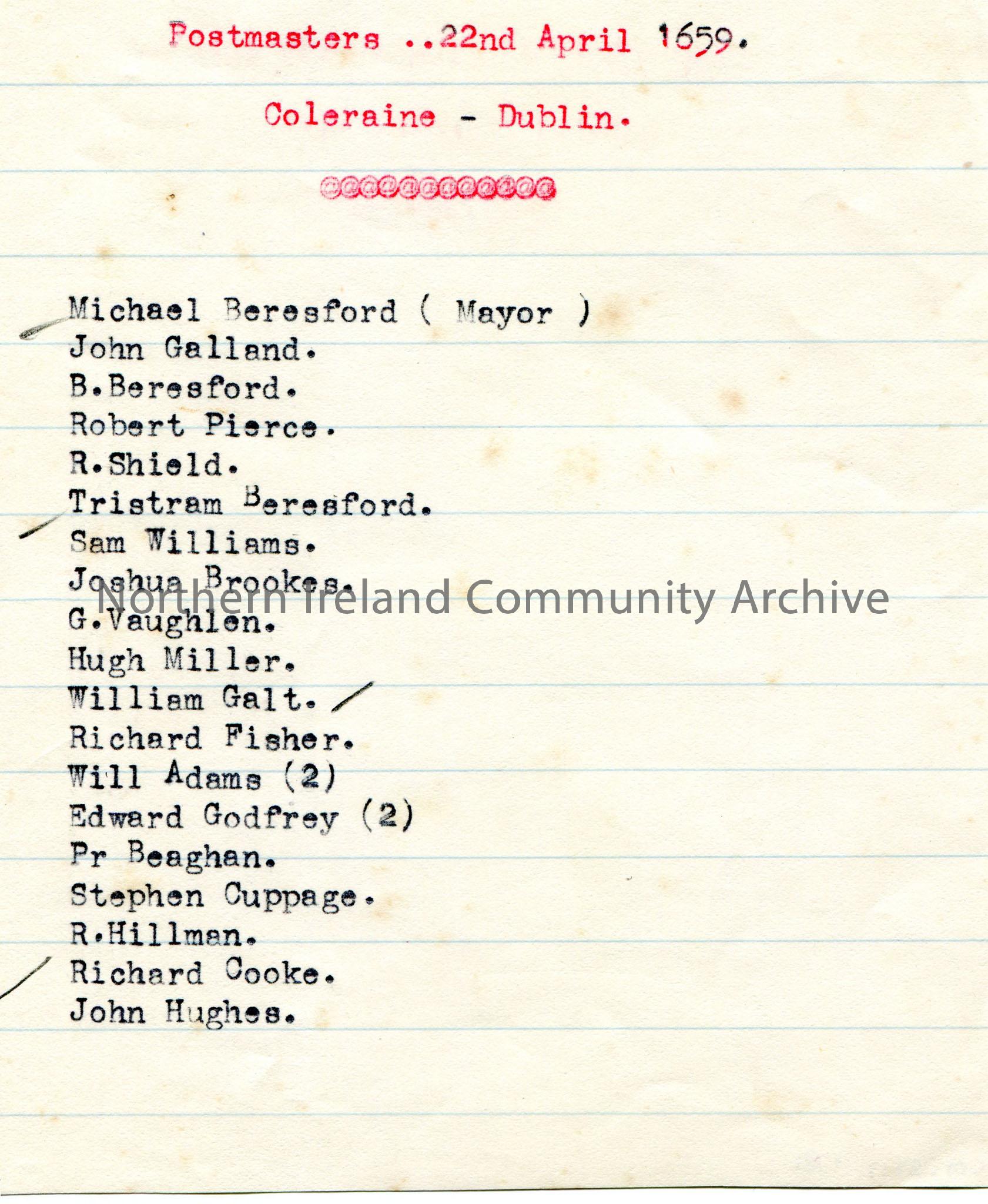 Typed list on lined paper of Postmasters. Dated 22nd April 1659, Coleraine – Dublin. Begins with Michael Beresford, Mayor and ends with John Hughes.