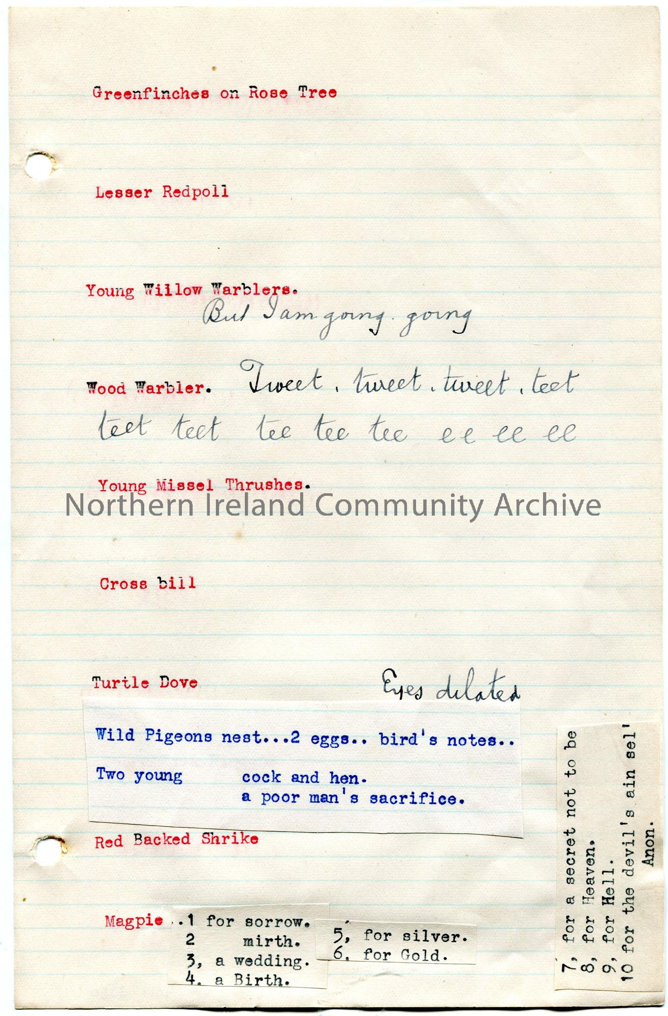 Typed list on lined paper of slides possibly for lecture. Typed in red. Brief notes typed or handwritten beside the slides. Rhyme typed beside the 'Magpie' slide.