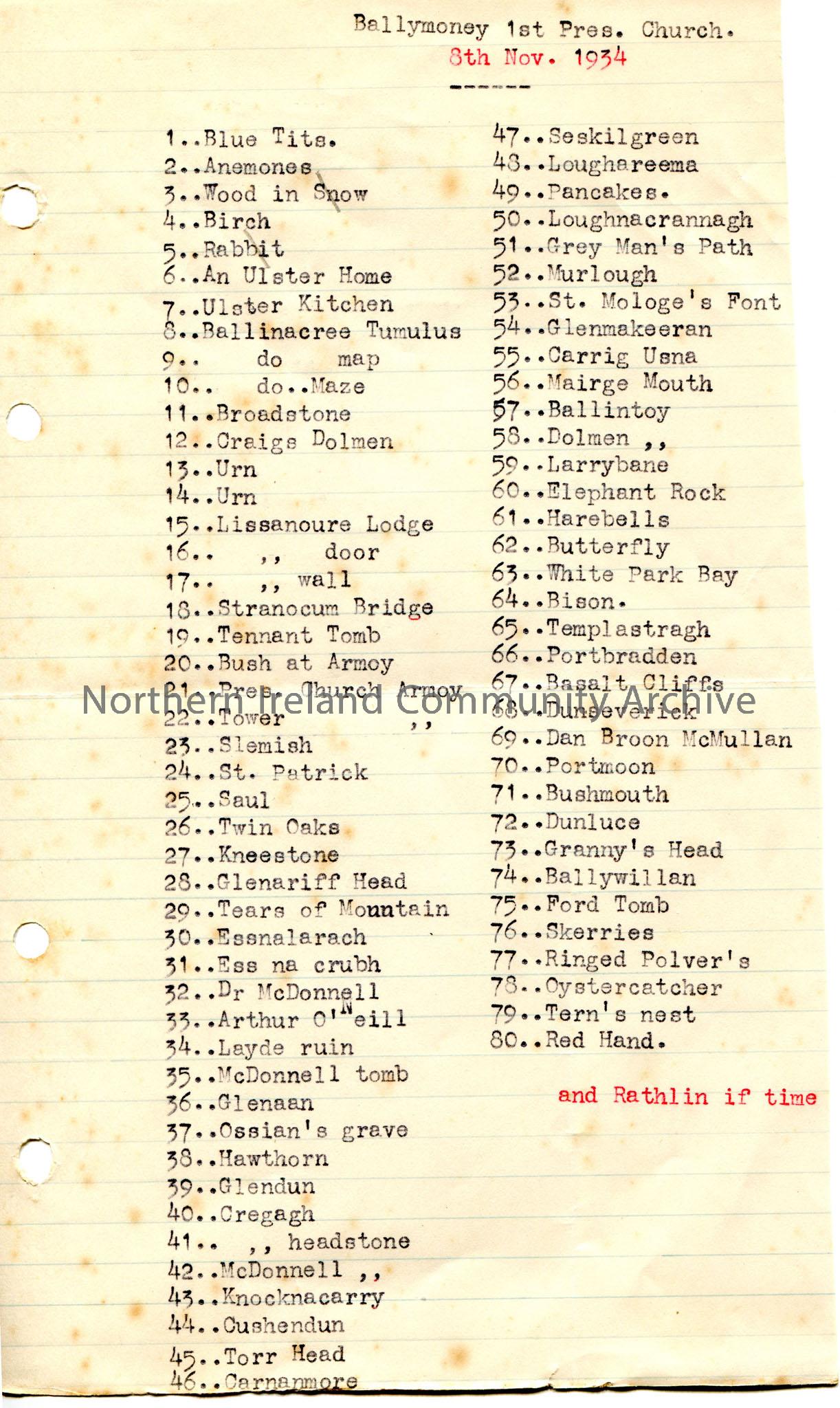 Typed list, possibly of slides for a lecture, titled, 'Ballymoney 1st Pres. Church. 8th Nov 1934'. Numbered 1-80. Begins with 'Blue Tits' and ends with 'Red Hand'.