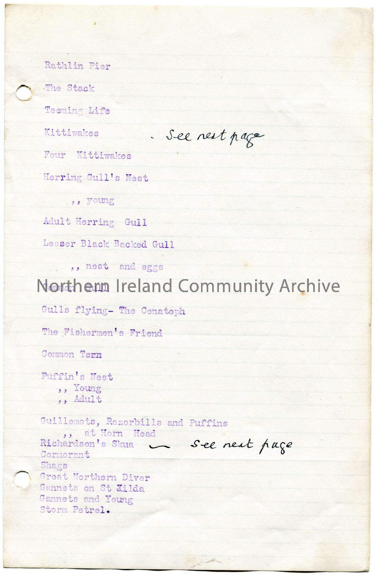 Typed list re birds. No titled or heading. List beings with ‘Rathlin Pier’ and ends with ‘Storm Petrel’. Possibly list of slides for lecture or talk.