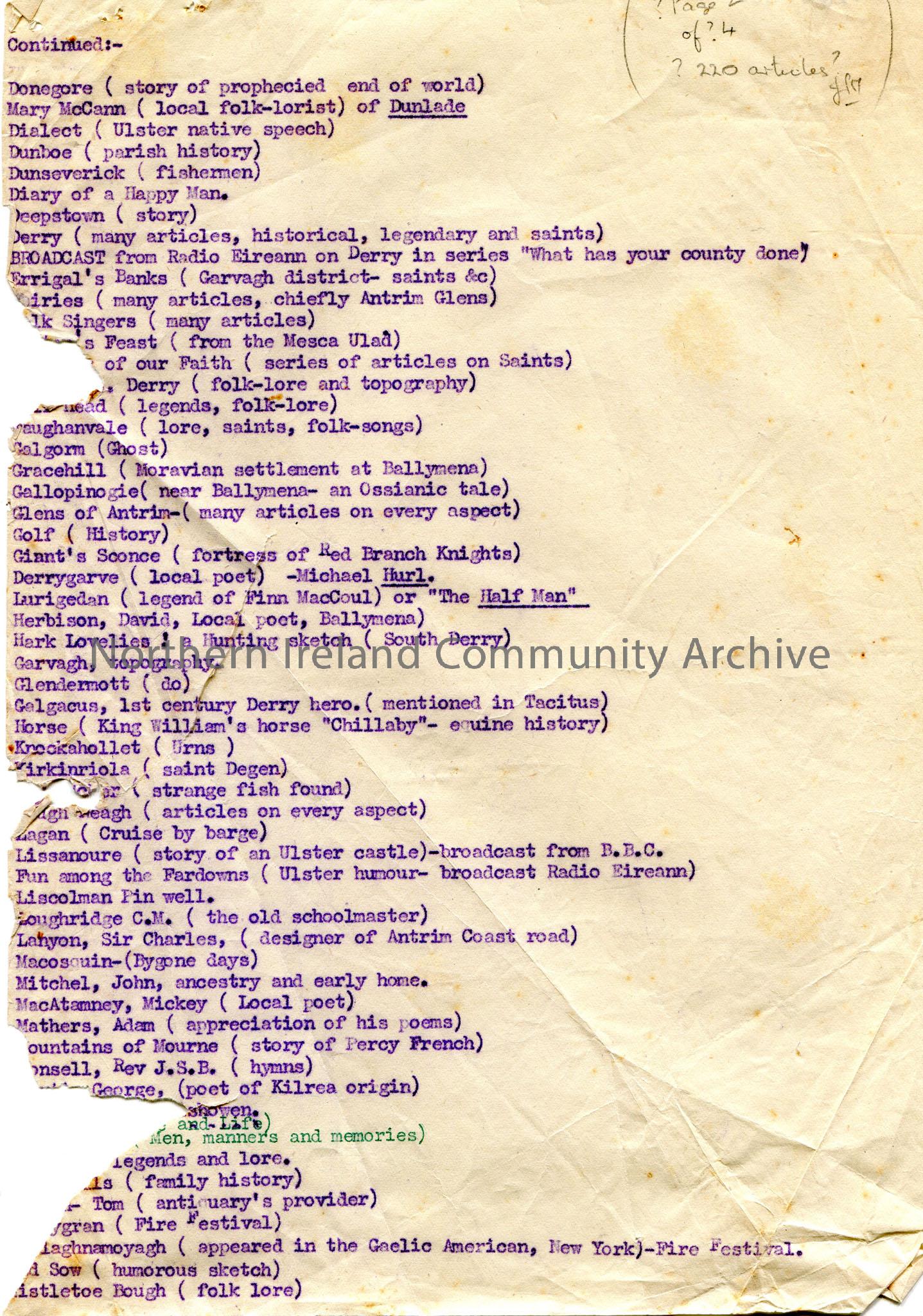 Typed list re placenames, people, broadcasts. Note in pencil top right '? Page 2 of ?4. ? 220 articles? JM'.