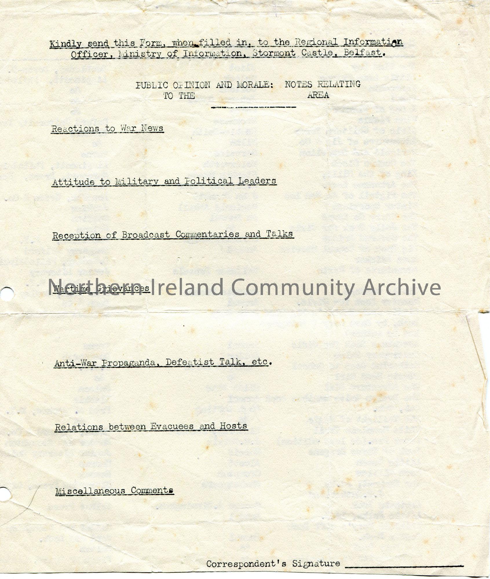 Typed list titled, 'Children's Books For Sale'. A note in red in top left corner explains the need to tick any a person wishes to buy. Six books are ticked in pencil. Typed on the back of a blank Ministry of Information sheet for collection of public opinion and morale.