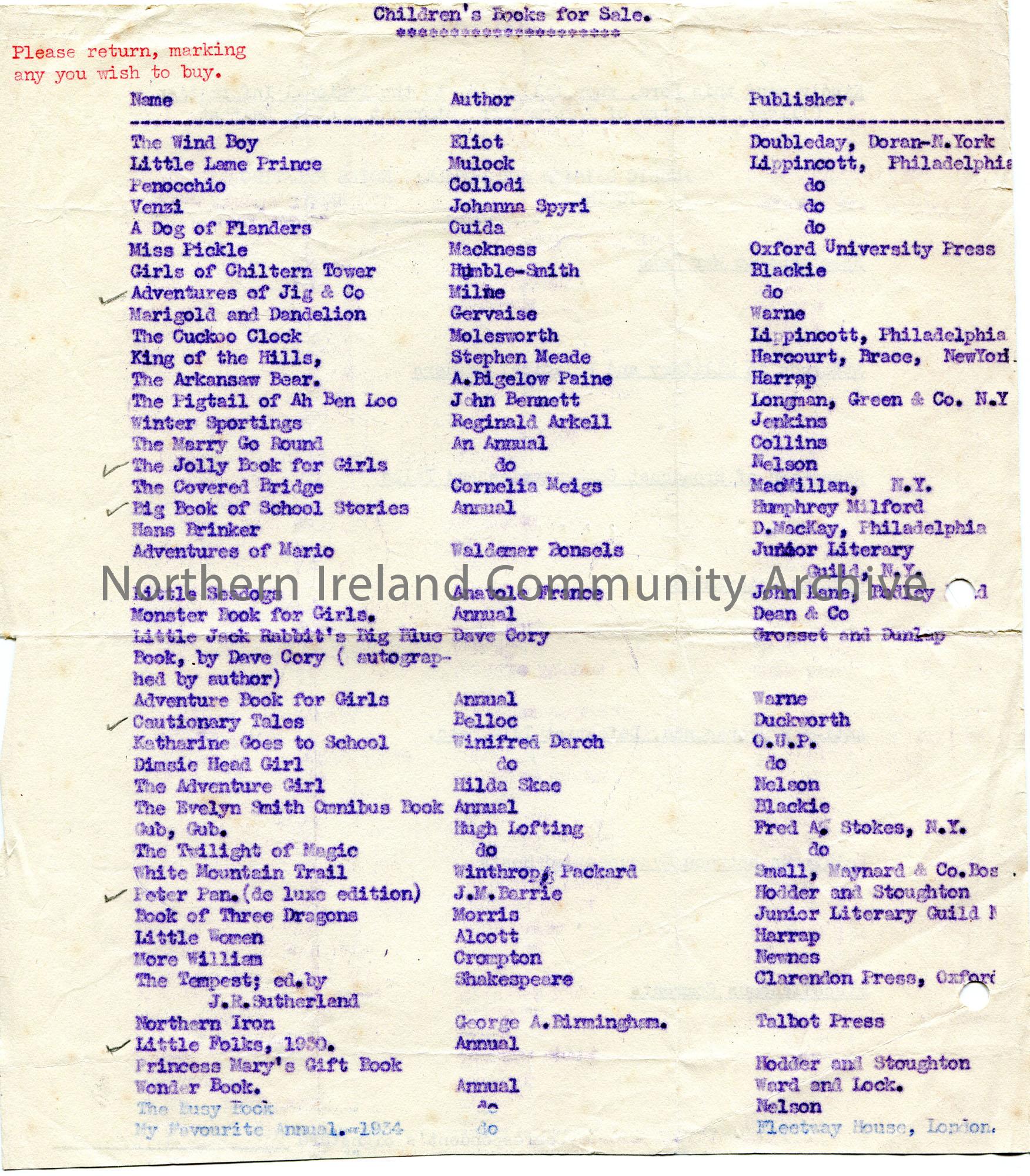 Typed list titled, ‘Children’s Books For Sale’. A note in red in top left corner explains the need to tick any a person wishes to buy. Six books are t…