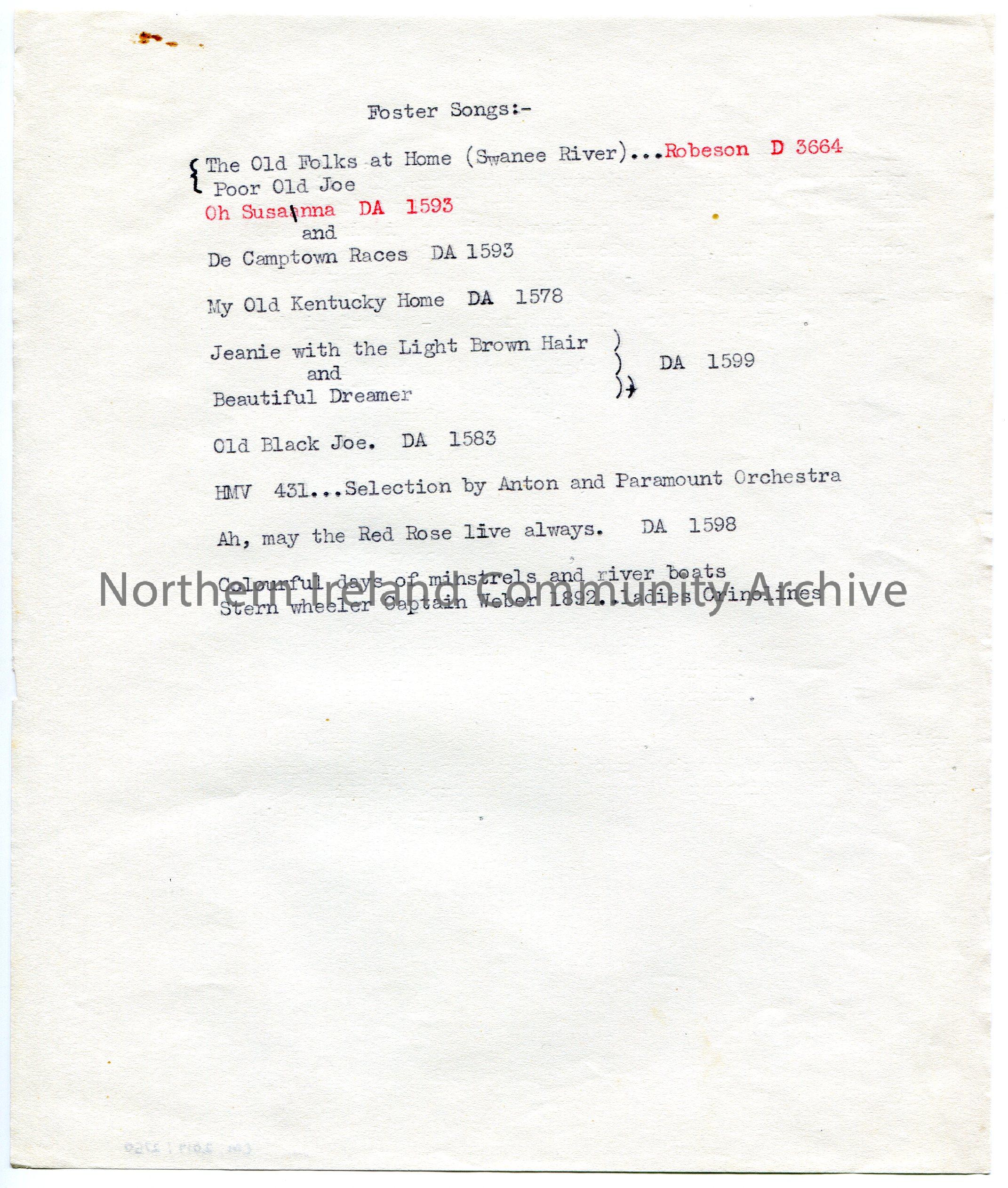 Typed list titled, ‘Foster Songs’.